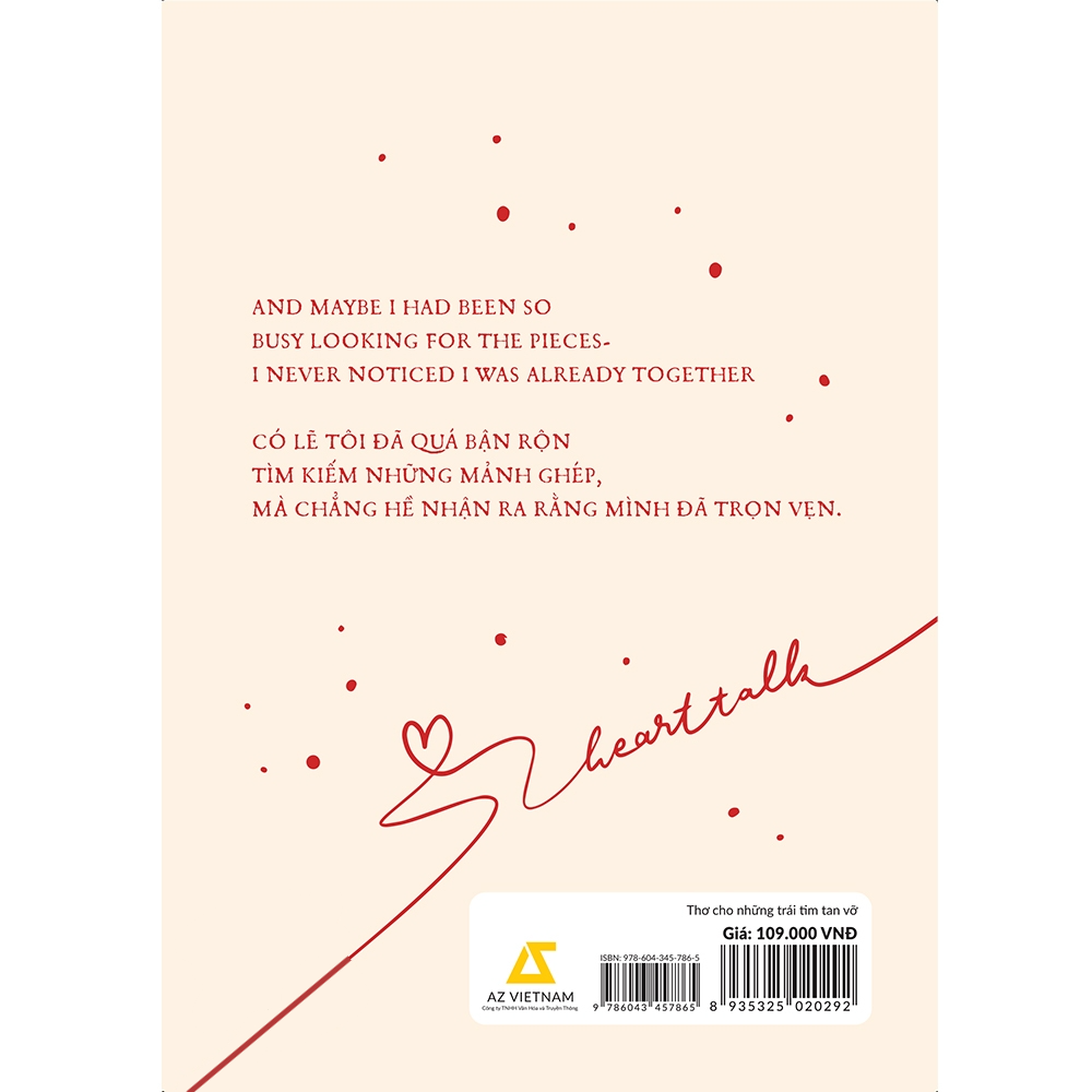 “Thơ cho những trái tim tan vỡ (Heart Talk)” mang đến nhiều bài học cảm động từ chính những chiêm nghiệm trong cuộc sống của tác giả Cleo Wade. Đây là một cuốn sách trí tuệ truyền cảm hứng, dễ tiếp cận với những bài thơ, văn xuôi và thông điệp ấn tượng về tình yêu, nỗi buồn, sự trưởng thành và nỗi sợ hãi. Tựa sách như một tấm gương soi chiếu nhiều điều mà chúng ta thường cho là đơn giản, nhưng đó lại là những điều quan trọng dễ bị bỏ qua nhất. Hy vọng thông qua “Heart Talk”, bạn sẽ có thêm nguồn động viên hàng ngày để luôn cảm thấy được tiếp thêm sức mạnh và động lực.