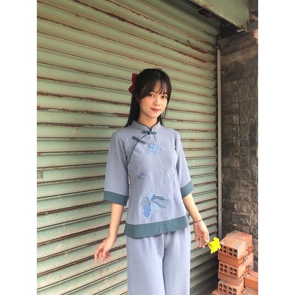 (Ảnh + Video shop tự quay) Bộ đồ lam đi chùa cổ tàu thêu sen gồm cả áo và quần, áo được thêu sen, quần có túi . Size: 24/26/28/30/32/34/36 ( tham khảo bảng chọn