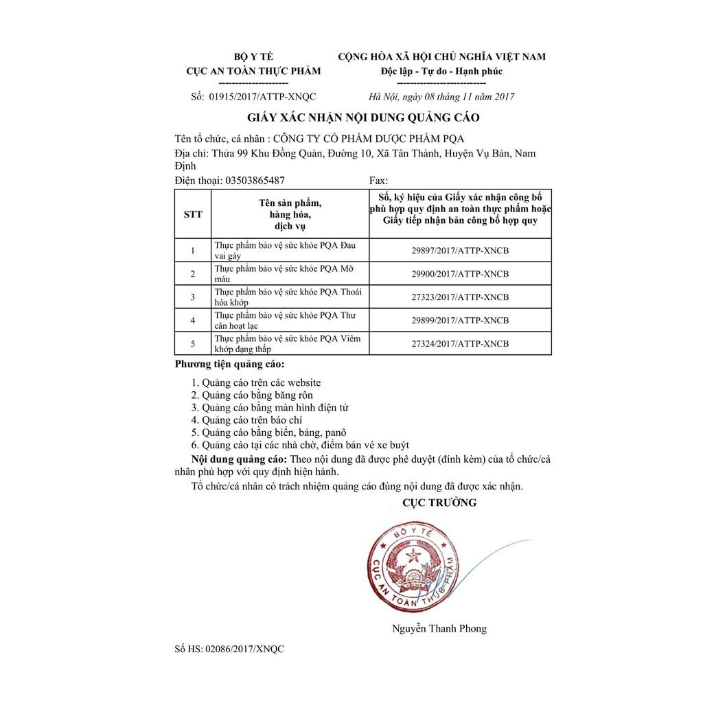 THÔNG TIN PQA VIÊN NANG VAI GÁY PQA Viên nang Vai Gáy là dược phẩm thảo dược hỗ trợ mạnh gân cốt, giúp giảm triệu chứng đau mỏi xương khớp cho người bị đau nhức mỏi xương