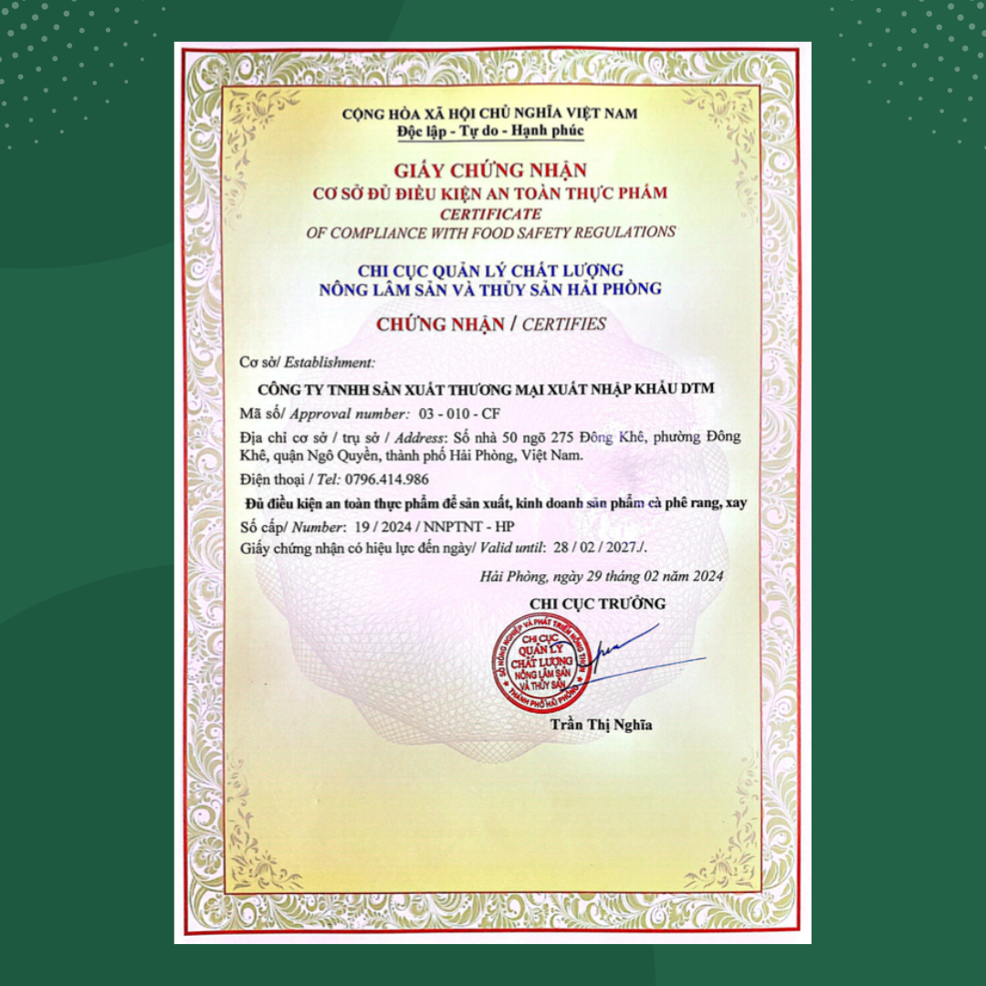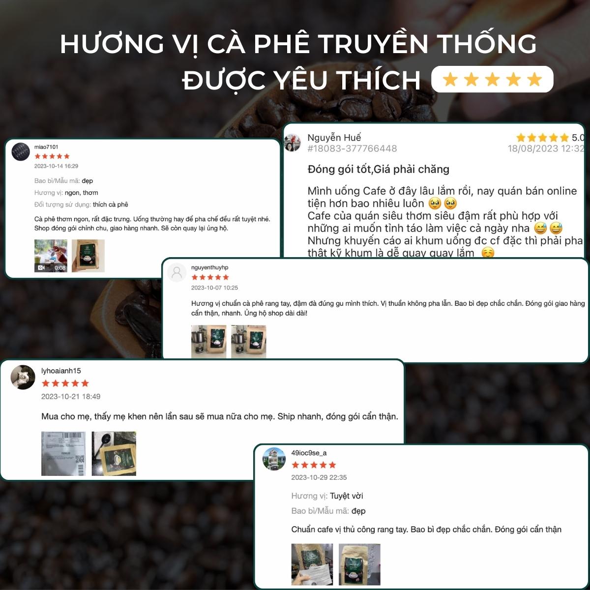 - Tuyệt đối: KHÔNG pha trộn các loại hạt khác, KHÔNG thêm hương liệu, KHÔNG chất tạo bọt. Sản phẩm đã được kiểm định và cơ sở sản xuất được cấp Giấy chứng nhận cơ sở đủ điều kiện an toàn thực phẩm. Văn hóa cà phê Việt Nam là cà phê Robusta với vị đắng mạnh, đậm đà.