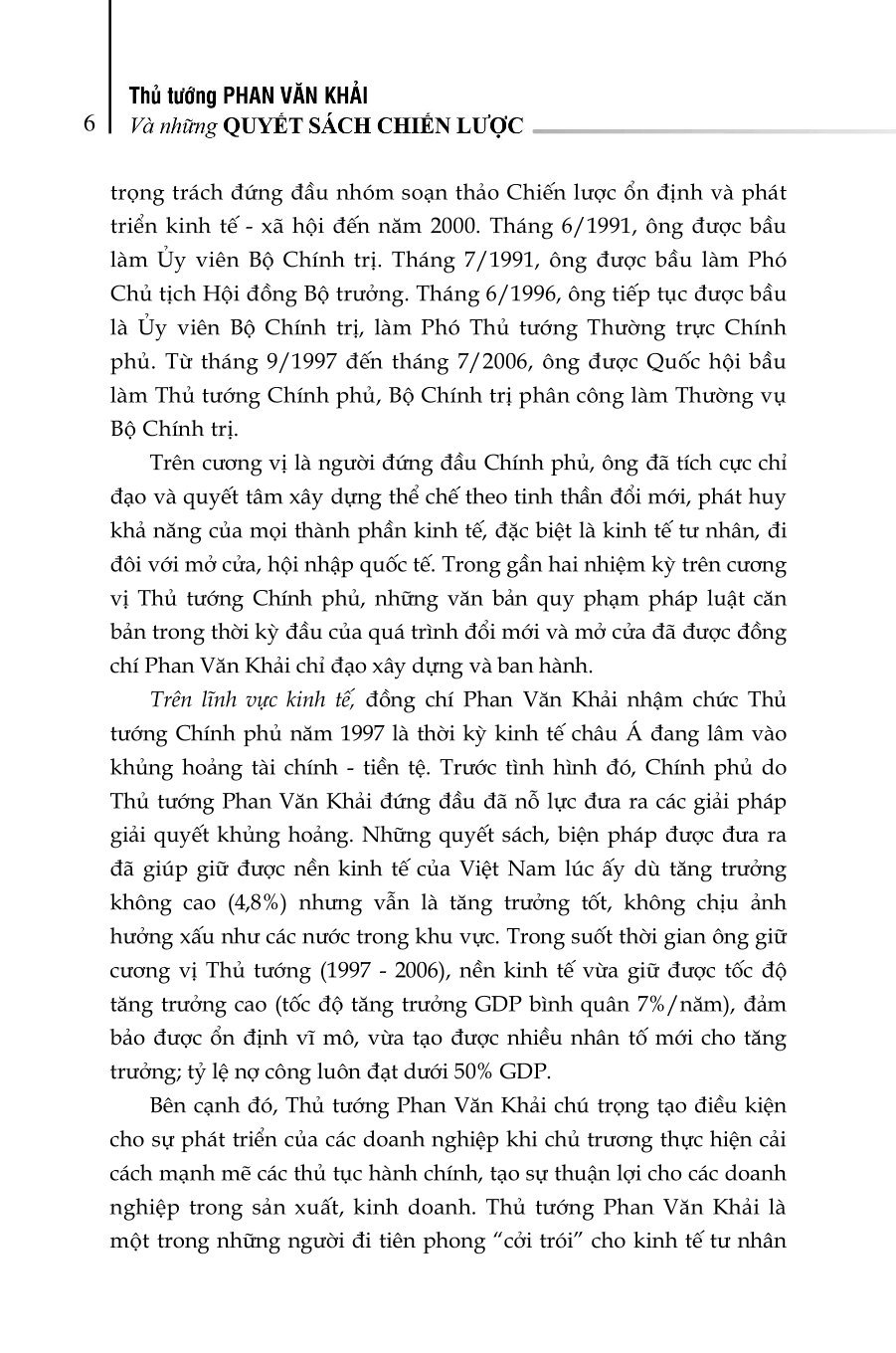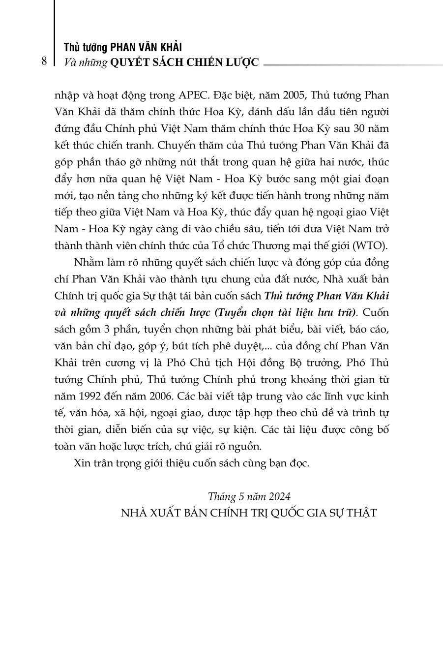 Nhằm làm rõ những quyết sách chiến lược và đóng góp của đồng chí Phan Văn Khải vào thành tựu chung của đất nước, Nhà xuất bản Chính trị quốc gia Sự thật tái bản cuốn sách Thủ tướng Phan Văn Khải và những quyết sách chiến lược (Tuyển chọn tài liệu lưu trữ).