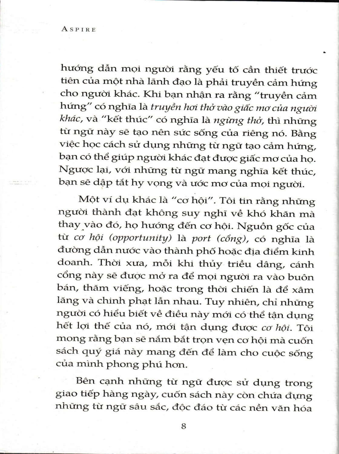 Giống như sự vận hành của bánh xe, các chương này phản ánh phạm vi ảnh hưởng của bạn được mở rộng từ trục bên trong, sau đó lan rộng ra để chi phối sự chuyển động của toàn bộ bánh xe. Chương cuối cùng – “Integrity” – có nghĩa là toàn vẹn hoặc hoàn chỉnh – sẽ hoàn thiện toàn bộ bánh xe phát triển này. Bạn có thể dễ dàng đọc hết cuốn sách này chỉ trong một lần. Bạn cũng có thể chọn riêng bất cứ chương nào bạn cho là phù hợp với mình và chậm rãi khám phá chiều sâu của nó một cách độc lập. Dù bằng cách nào thì cuốn sách vẫn sẽ tiết lộ những điểm mấu chốt giúp bạn khám phá ra tiềm năng thật sự ẩn bên trong con người bạn.