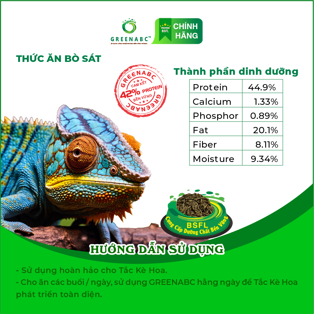 THỨC ĂN TẮC KÈ HOA CHAMELEON - BỔ SUNG DINH DƯỠNG PROTEIN 44.9%, CANXI 1.33%, LIPID 20.1% Sản phẩm GREENABC cung cấp các giá trị dinh dưỡng bền vững cho thú cưng, giúp cho