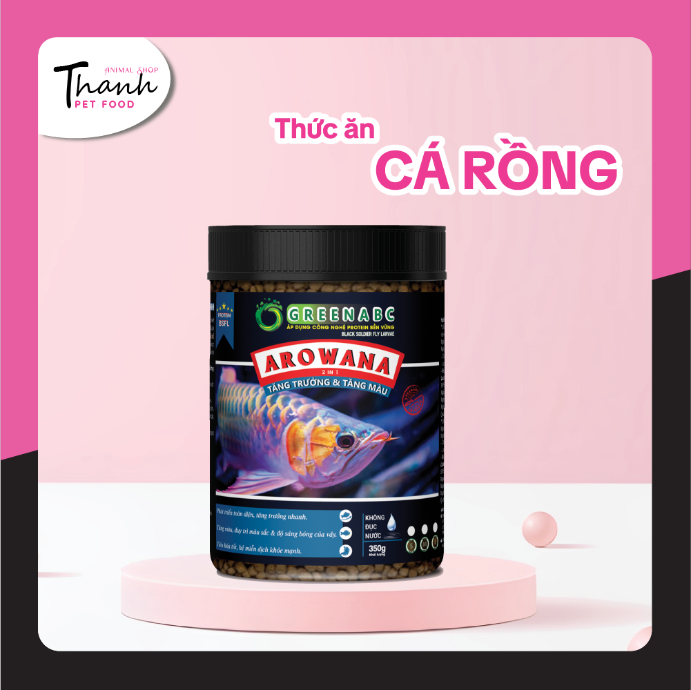 GREENABC - THỨC ĂN CÁ RỒNG - HÀM LƯỢNG PROTEIN > 40% GREENABC là thức ăn cao cấp dành cho CÁ RỒNG. Đặc biệt sản phẩm GREENABC được sản xuất theo phương pháp Áp dụng công nghệ PROTEIN bền vững từ bột đạm G.Meal rất giàu PROTEIN – CANXI – LIPID có trong BSFL, đã được Mỹ (AAFCO) và EU chấp nhận đưa vào công thức cho ngành sản xuất thức ăn cho vật nuôi. Sản phẩm GREENABC cung cấp các giá trị dinh dưỡng bền vững cho thú cưng, giúp cho Cá Rồng:      + Cơ thể phát triển toàn diện, tăng trưởng nhanh và tốt một cách tự nhiên.      + Tăng cường và duy trì màu sắc, độ sáng bóng của vảy.      + Tiêu hóa tốt, hấp thụ toàn bộ các chất dinh dưỡng từ thức ăn.      + Tăng sức đề kháng, hệ miễn dịch khỏe mạnh nhằm tránh bệnh tật.      + Không đục nước, không gây ô nhiễm nguồn nước. Thành phần dinh dưỡng và hướng dẫn sử dụng: