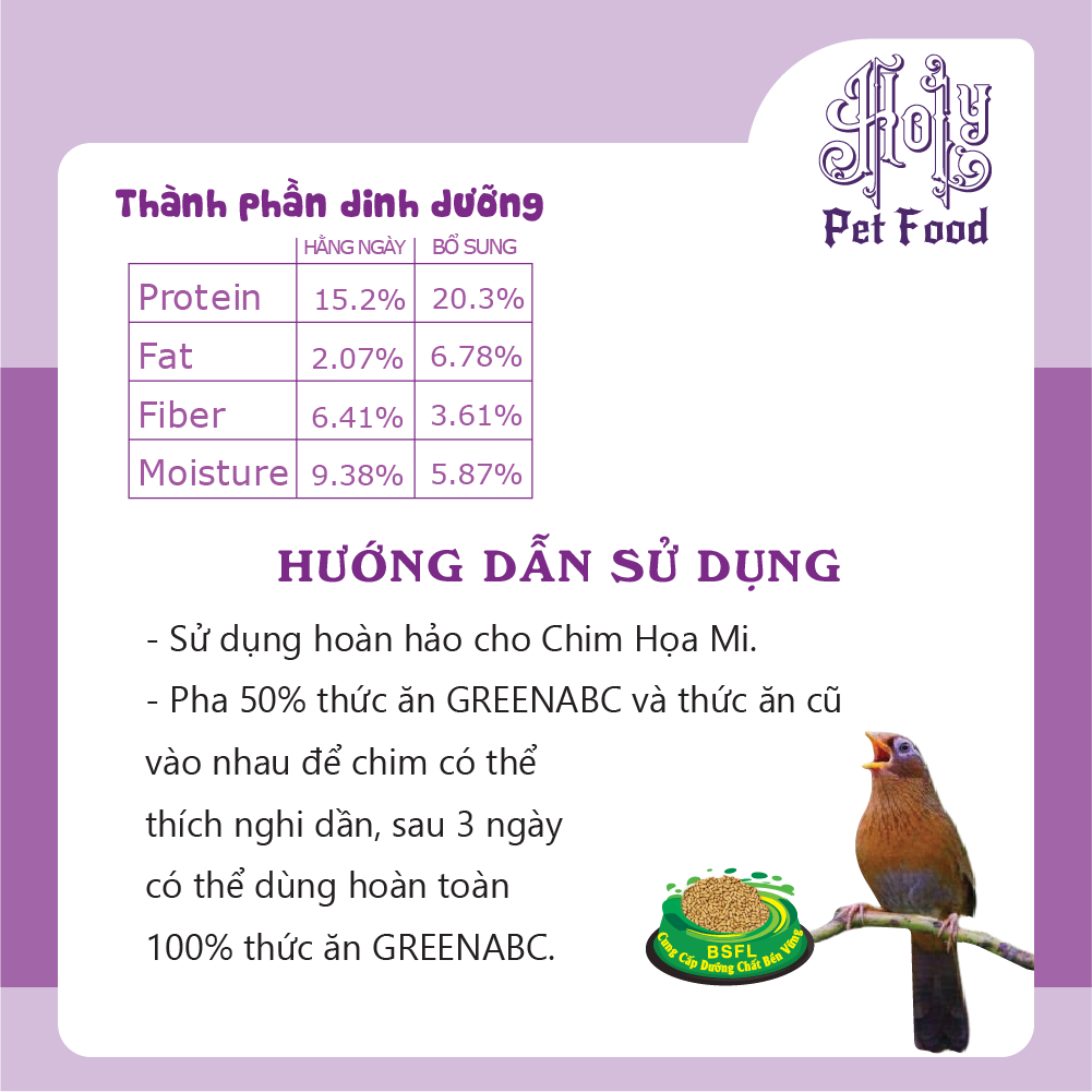 GREENABC - THỨC ĂN CHIM HỌA MI HÀNG NGÀY & BỔ SUNG GREENABC là thức ăn cao cấp dành cho CHIM HỌA MI. Đặc biệt sản phẩm GREENABC được sản xuất theo phương pháp Áp dụng công nghệ PROTEIN bền