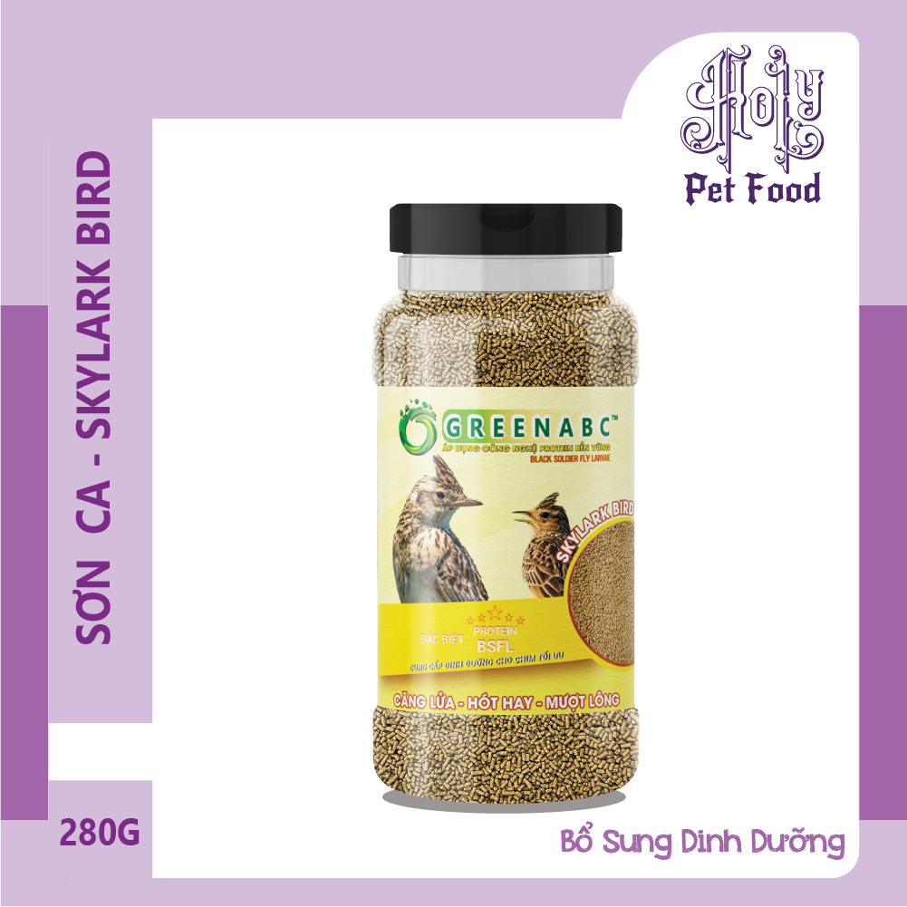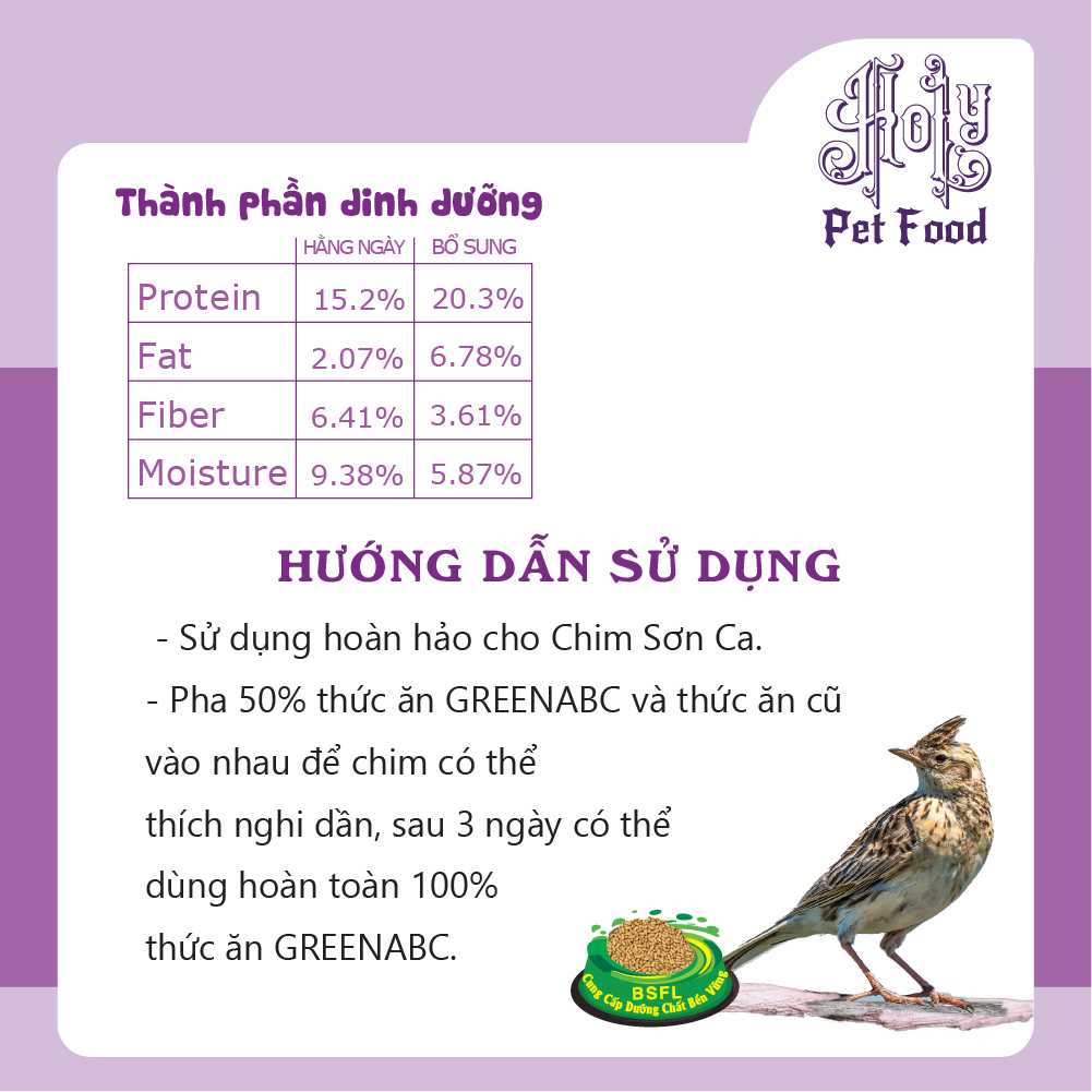 GREENABC - THỨC ĂN CHIM SƠN CA HÀNG NGÀY & BỔ SUNG GREENABC là thức ăn bổ dưỡng dành cho CHIM SƠN CA. Đặc biệt sản phẩm GREENABC được sản xuất theo phương pháp Áp dụng công nghệ PROTEIN bền vững từ bột đạm rất giàu PROTEIN – CANXI – LIPID có trong BSFL, đã được Mỹ (AAFCO) và EU chấp nhận đưa vào công thức cho ngành sản xuất thức ăn cho vật nuôi. Sản phẩm GREENABC cung cấp các giá trị dinh dưỡng bền vững cho thú cưng, giúp chim:      + Kích thích vị giác, ăn ngon miệng hơn      + Tiêu hóa tốt, tăng cường hấp thụ các dưỡng chất.      + Cơ thể khỏe mạnh, cân đối săn chắc, căng lửa đều ổn định.      + Thay lông nhanh, màu sắc lông rực rỡ.      + Tăng cường miễn dịch, chống lại các bệnh thường gặp. Đặc biệt với thành phần G.Meal đầy đủ các dưỡng chất cần thiết giúp cơ thể phát triển toàn diện.