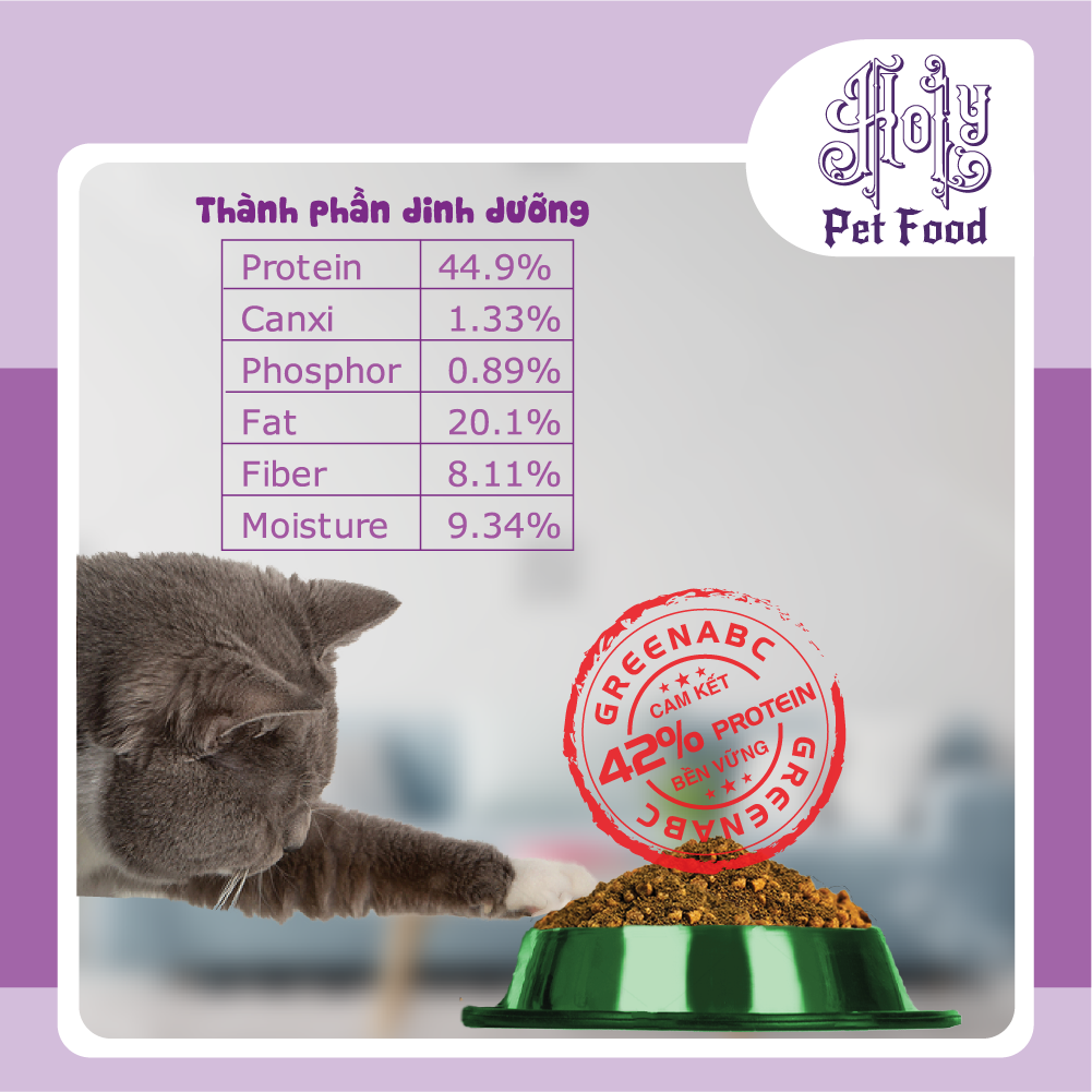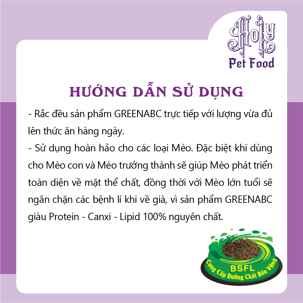 GREENABC là thức ăn cao cấp dành cho các mèo. Đặc biệt sản phẩm GREENABC được sản xuất theo phương pháp Áp dụng công nghệ PROTEIN BỀN VỮNG từ bột đạm G.Meal rất giàu PROTEIN–CANXI–LIPID có trong BSFL*, đã được Mỹ (AAFCO) và EU chấp nhận đưa vào công thức cho ngành sản xuất thức ăn dành cho thú cưng.
