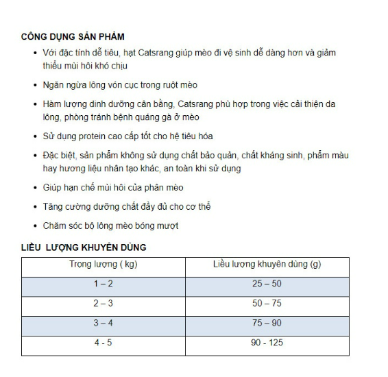 1 . Áp dụng cho mọi loại mèo Sản phẩm thức ăn dạng hạt cho mèo CATSRANG đáp ứngnhu cầu cho thú cưng của bạn. Sản phẩm này không dành riêng cho bất kỳ một loại mèo nào nhưng là sản phẩm đáp ứng được khẩu vị của tất cả các chú mèo, bất kể chủng loại.
