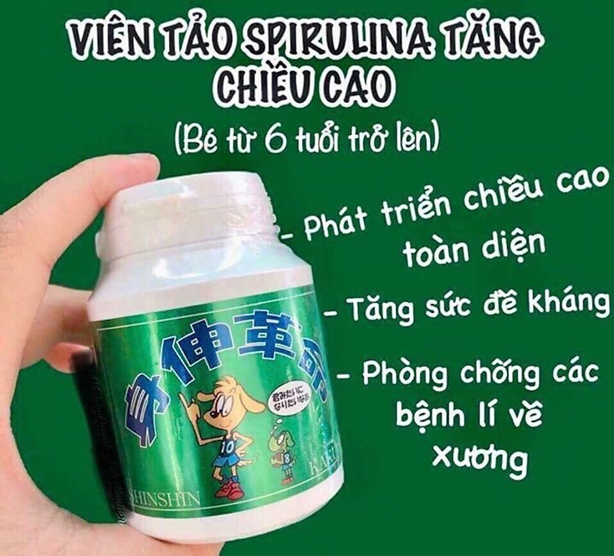 - Dùng viên tảo Shinshin Kakumei liên tục trong độ tuổi trẻ đang phát triển chiều cao và cân nặng để phát huy được hết công dụng của tảo.