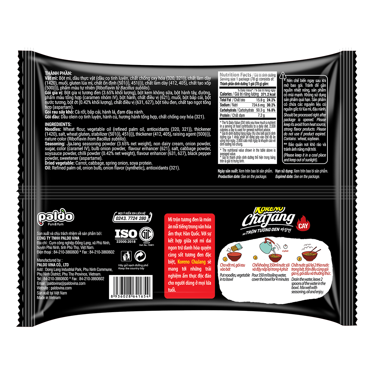 - Mì xào Koreno vị gà phomai sử dụng các thành phần nguyên liệu được lựa chọn kỹ lưỡng: bột mì, dầu thực vật, tinh bột khoai mì, bột hương gà, bột phomai, dầu đậu