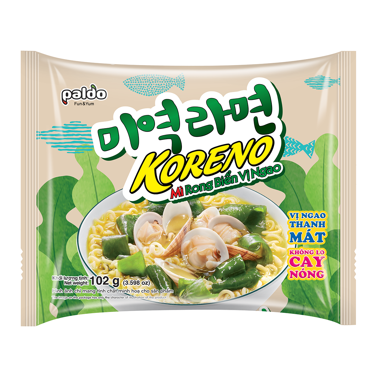 - Mì Koreno Rong Biển Vị Ngao với vị ngao kết hợp rong biển ngon lành, dễ ăn, mang hương vị Hàn Quốc. Sản phẩm được chế biến theo công nghệ Hàn Quốc giúp cho