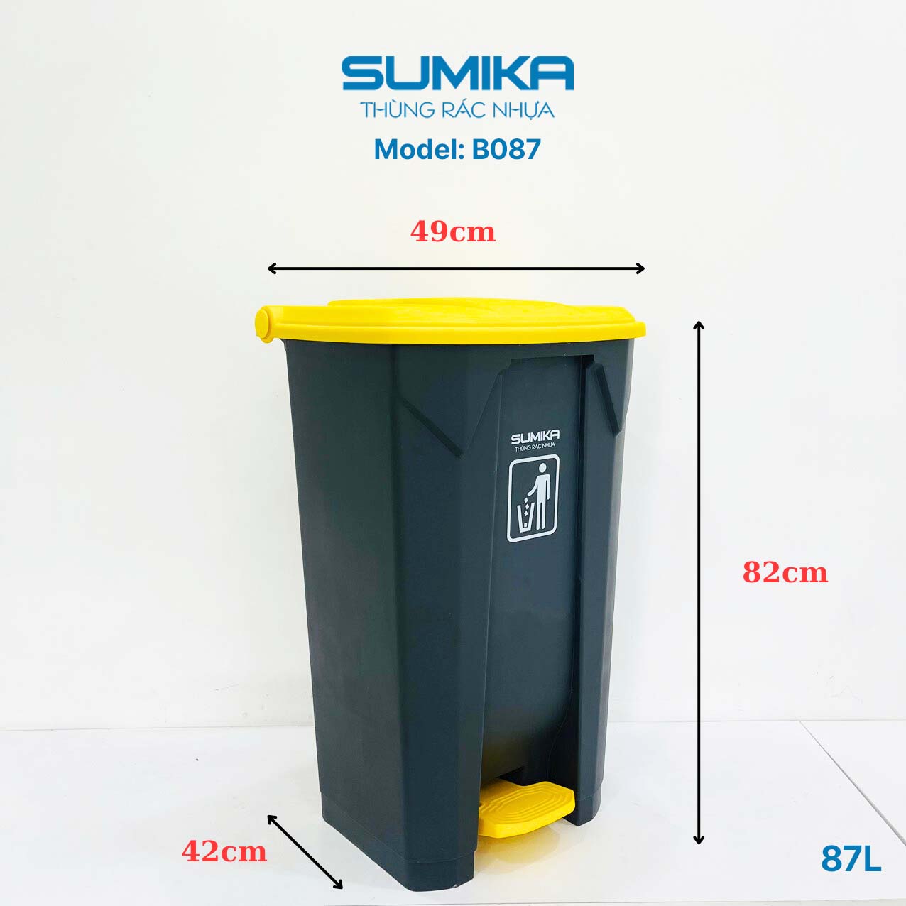 Thùng rác nhựa đạp chân SUMIKA B087 dung tích 87L là lựa chọn tuyệt vời cho việc thu gom rác thải trong gia đình, văn phòng, phòng bếp hay phòng vệ sinh. Thùng được làm