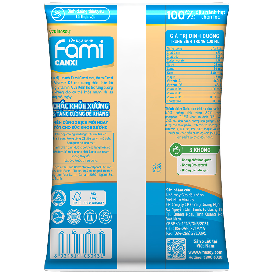 - Thùng Sữa đậu nành Fami Canxi (200ml x 40 Bịch) được làm từ 100% đậu nành hạt chọn lọc, không biến đổi Gen (Non - GMO). - Công thức đột phá mới từ Fami