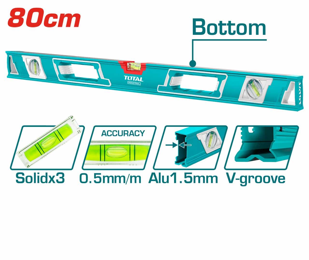 Thông số kĩ thuật -Mã sản phẩm : -Nhà sản xuất: Total TMT23086 Chiều dài: 30cm. Hai mặt bên. Độ chính xác: 0,5mm / m. TMT24086 Chiều dài:40cm. Độ chính xác 0,5 mm / m TMT28086 Chiều dài:80cm. Độ chính xác 0,5 mm / m TMT22006 Chiều dài 200cm - Độ chính xác: 0,5mm / m