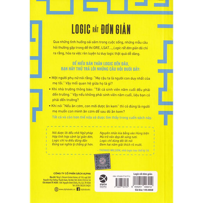 - Nếu một người mẹ nói với con: “Nếu ăn hết cơm, con có thể được ăn tráng miệng” thì có thực sự là trẻ phải ăn hết cơm thì mới được ăn tráng miệng? Đánh giá của chuyên gia, tổ chức uy tín về cuốn sách cùng các giải thưởng: “Đọc văn của Bennett… giống như một cuộc trò chuyện bên tách cà phê của những người trí thức sành sỏi… không gì có thể gợi mở và khiến độc giả hứng thú hơn.” – SIMON INGS, NEW SCIENTIST “Trong trường hợp này, bạn có thể đánh giá một cuốn sách qua bìa sách – hay chí ít là nhan đề: tác giả đã đưa ra lời hứa ở ngay từ đầu và thực hiện nó bằng cách khiến logic thật dễ hiểu đối với bạn đọc.” – MANYA CHYLINSKI, LIBRARY JOURNAL Trích đoạn hay : Tật khó tưởng tượng nếu các suy luận trong đời sống hằng ngày lại không dựa trên tư duy logic. Bác sĩ, cũng như thợ sửa ô tô, phải tư duy dựa trên các triệu chứng mình thấy. Cảnh sát điều tra và chuyên gia pháp y phải xử lý và tư duy logic từ các manh mối. Người dùng máy tính phải làm quen với các quy tắc logic mà máy móc được thiết kế để tuân theo. Các quyết định kinh doanh dựa trên phân tích logic tình hình thực tế và những bất ngờ có thể xảy ra. Về tác giả: Deborah J. Bennett dạy môn toán tại Đại học New Jersey City ở Jersey City, New Jersey được mệnh danh là “người giỏi xuất sắc” với trong biến các vấn đề trừu tượng trở nên “dễ hiểu và ấn tượng”. Trong cuốn sách này, tất cả lý thuyết, lịch sử và giai thoại đều được trình bày theo lối dễ hiểu và hài hước nhất. Logic rất đơn giản thực sự là cuốn sách hiếm hoi giúp bạn hiểu tường tận về tư duy logic.