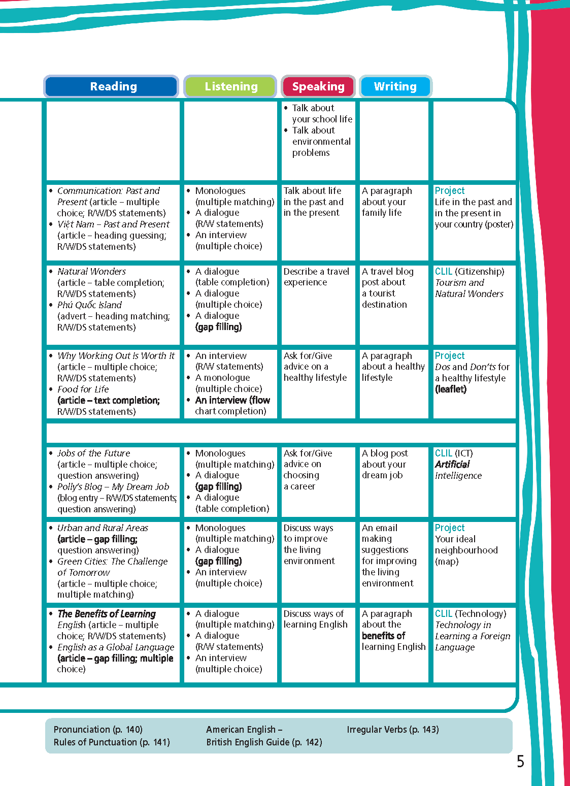 Bộ sách Tăng cường Kĩ năng Đọc, Nghe và Giao tiếp được thiết kế dành cho học sinh Trung học cơ sở và Trung học phổ thông (từ lớp 6 đến lớp 12) Với các