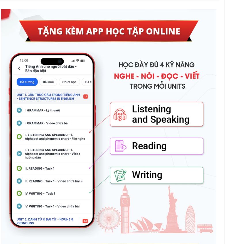 - Đầy đủ 4 kỹ năng: Nghe - Nói - Đọc - Viết.