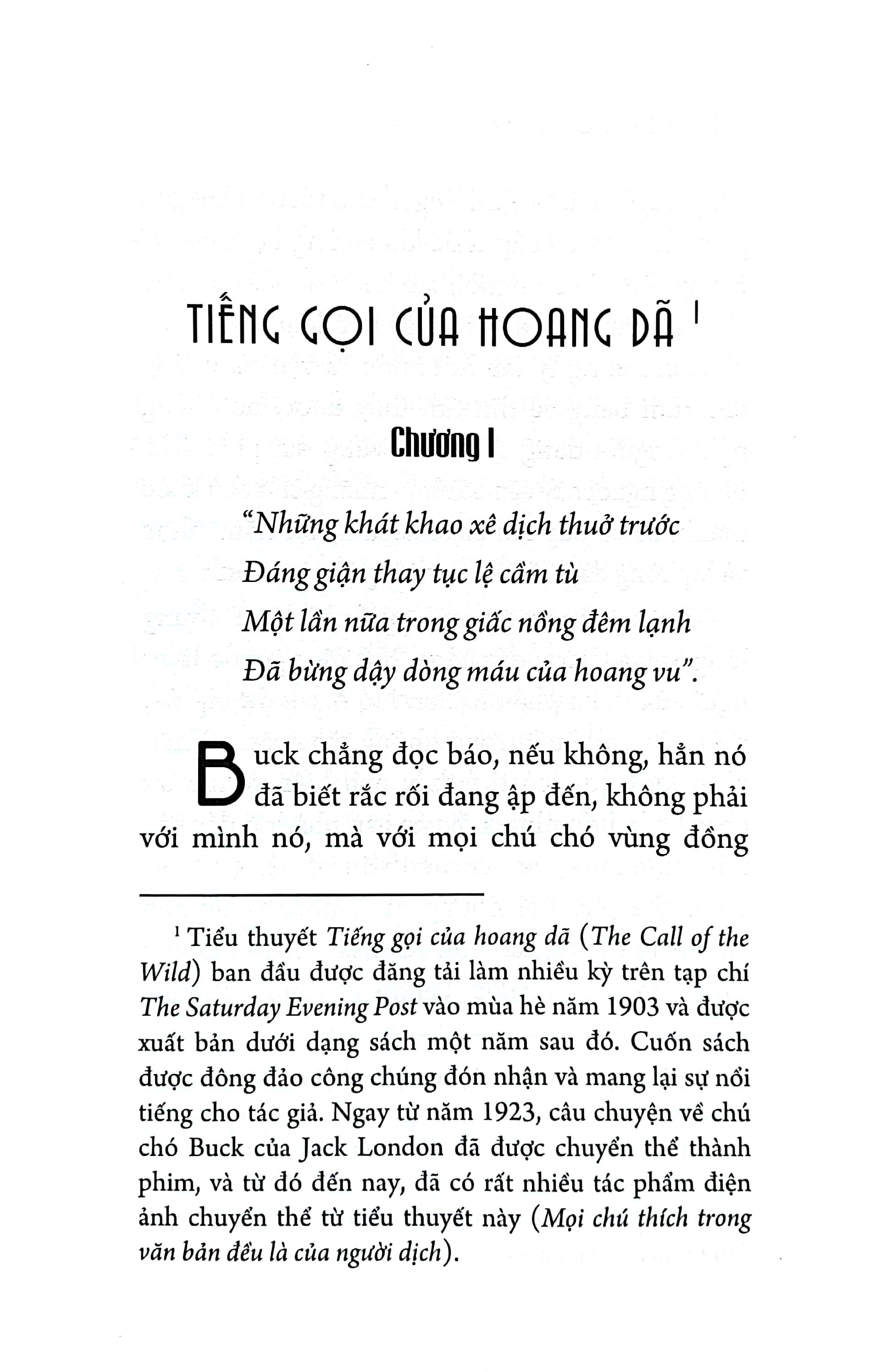 “Buck nằm đấy suốt quãng thời gian còn lại của buổi tối mệt mỏi, ôm nỗi phẫn nộ và lòng kiêu hãnh đã bị tổn thương. Nó không sao hiểu nổi tất cả mọi chuyện vừa xảy ra. Những kẻ lạ mặt kia muốn gì ở nó chứ? Sao họ lại giam giữ nó trong cái thùng thưa chật hẹp này? Nó không biết tại sao, nhưng nó cảm thấy bức bối bởi dự cảm mơ hồ về một tai họa đương lơ lửng đâu đó. Nhiều lần trong đêm, nó đứng phắt dậy khi cánh cửa căn chòi lạch cạch mở, mong thấy ngài Thẩm phán hay chí ít là các cậu chủ. Nhưng lần nào cũng là bản mặt phì nộn của tay chủ quán rượu đang nhìn chằm chằm vào nó dưới ánh sáng leo lét của ngọn nến làm từ mỡ bò. Và lần nào, tiếng sủa đầy vui mừng mới rung lên trong họng Buck cũng biến thành tiếng gầm gừ giận dữ.”