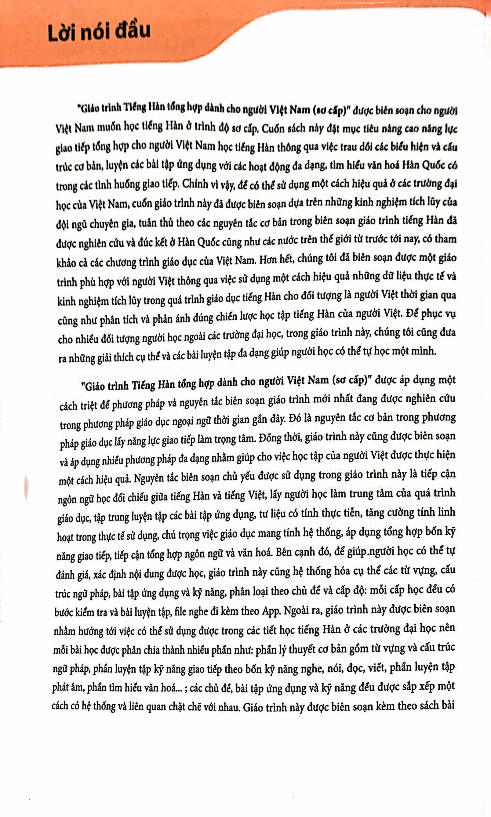 Tiếng Hàn Tổng Hợp Dành Cho Người Việt Nam - Sơ Cấp 1 Trong những năm gần đây, nhu cầu học tiếng Hàn và tìm hiểu về văn hóa Hàn Quốc đang có xu hướng tăng lên. Người học tiếng Hàn rất mong muốn có được một bộ giáo trình chuẩn, được biên soạn một cách tỉ mỉ và hữu ích nhất. Giáo trình tiếng Hàn tổng hợp lần đầu tiên được trao bản quyền chính thức tại Việt Nam Hiểu được điều đó, ngày 4-7, Đại diện chính phủ Hàn Quốc, ngài Woo Hyeong Min – Trưởng đại diện Văn phòng Quỹ giao lưu Quốc tế HQ tại Việt Nam cùng GS.TS.NGƯT Mai Ngọc Chừ – Chủ tịch Hội Nghiên cứu khoa học về Hàn Quốc của Việt Nam (KRAV) đã trao quyết định cho phép Công ty Cổ phần sách MCBooks của Việt Nam được xuất bản cuốn sách này tại thị trường Việt Nam. Và đây chính là bộ giáo trình tiếng Hàn tổng hợp đầu tiên có bản quyền chính thức có mặt tại Việt Nam. Cũng theo ông Woo Hyeong Min, Thực tế đây là bộ giáo trình chính thống mà tất cả người học tiếng Hàn tại Việt Nam cần sử dụng. Tuy nhiên nhiều năm qua bộ sách đến tay người dùng đều là sách lậu nên chưa đạt được kết quả mà chính phủ Hàn muốn mang tới Việt Nam. Do đó Chính phủ Hàn Quốc đã quyết định tìm 1 đơn vị xuất bản uy tín của Việt Nam để giúp họ mang đến cho người học những cuốn sách tiếng Hàn chất lượng tốt với giá cả hợp lý. Bộ giáo trình được Hội nghiên cứu khoa học Hàn Quốc của Việt Nam biên soạn và hiệu đính. Bộ giáo trình sẽ giúp nâng cao hiệu quả trong việc sử dụng ngôn ngữ Hàn sau tiếng mẹ đẻ và tiếng Anh, là nền tảng giúp người lao động Việt Nam nhận được những vị trí làm việc cao trong doanh nghiệp Hàn Quốc. Đây cũng là cách để thúc đẩy quan hệ hợp tác về văn hoá và giáo dục giữa hai nước trong thời gian tới. Giới thiệu cuốn Giáo trình tiếng Hàn tổng hợp dành cho người Việt Nam – Sơ cấp 1 Giáo trình tiếng Hàn tổng hợp dành cho người Việt Nam – Sơ cấp 1 được biên soạn dành cho người Việt Nam muốn học tiếng Hàn ở trình độ sơ cấp. Sách được biên soạn nhằm hướng tới việc sử dụng được trong các tiết học tiếng Hàn tại giảng đường đại học nên mỗi bài học được chia thành nhiều phần như: Lý thuyết cơ bản gồm từ vựng và cấu trúc ngữ pháp; phần luyện tập theo 4 kỹ năng giao tiếp như: Nghe – Nói – Đọc – Viết, phần luyện phát âm, phần tìm hiểu văn hóa… Các chủ đề trong sách được sắp xếp một cách có hệ thống và liên quan chặt chẽ với nhau. Giáo trình tiếng Hàn tổng hợp được biên soạn kèm theo một cuốn sách bài tập hỗ trợ giúp người học ôn tập kỹ hơn và có thể luyện tập nâng cao trong những trường hợp cần thiết. Nội dung trong Giáo trình tiếng Hàn tổng hợp – Sơ cấp 1 2 cuốn sách trong bộ Sơ cấp được xây dựng với 30 bài khóa và bảng chữ cái. Trong đó quyển 1 gồm phần bảng chữ cái và 15 bài đầu. Học hết quyển 1, bạn sẽ học đến quyển sơ cấp 2 với 15 bài còn lại. Cấu trúc tổng thể của giáo trình được xây dựng theo các chủ đề; mỗi chủ đề được liên kết thống nhất với một hệ thống các từ vựng và cấu trúc ngữ pháp cơ bản, bài tập ứng dụng, kỹ năng và tìm hiểu văn hóa. Trong mỗi bài học, nội dung học được chia thành các phần như: luyện từ vựng, luyện ngữ pháp cơ bản, luyện tập kỹ năng nghe – nói – đọc – viết, luyện phát âm, tìm hiểu văn hóa của đất nước Hàn Quốc xinh đẹp. Và kết thúc mỗi bài đều có thêm bảng từ mới xuất hiện trong bài học. Phần cuối của sách, các tác giả đưa ra hệ thống từ mới được sắp xếp theo thứ tự của bảng chữ cái. Đây là những từ không xuất hiện trong phần ngữ pháp, từ vựng cơ bản; nhưng lại xuất hiện nhiều ở phần luyện tập của từng bài.