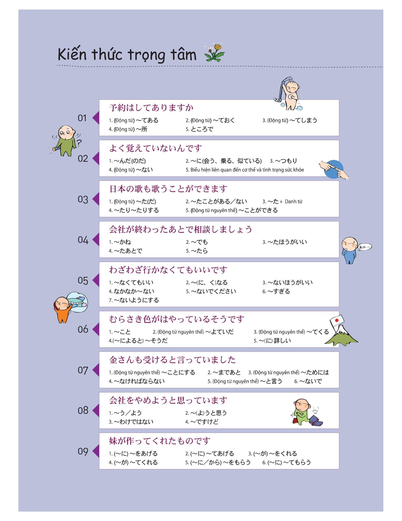 – Cuốn sách gồm tổng cộng 18 bài, mỗi bài bao gồm cả nội dung về hội thoại và ngữ pháp cơ bản.