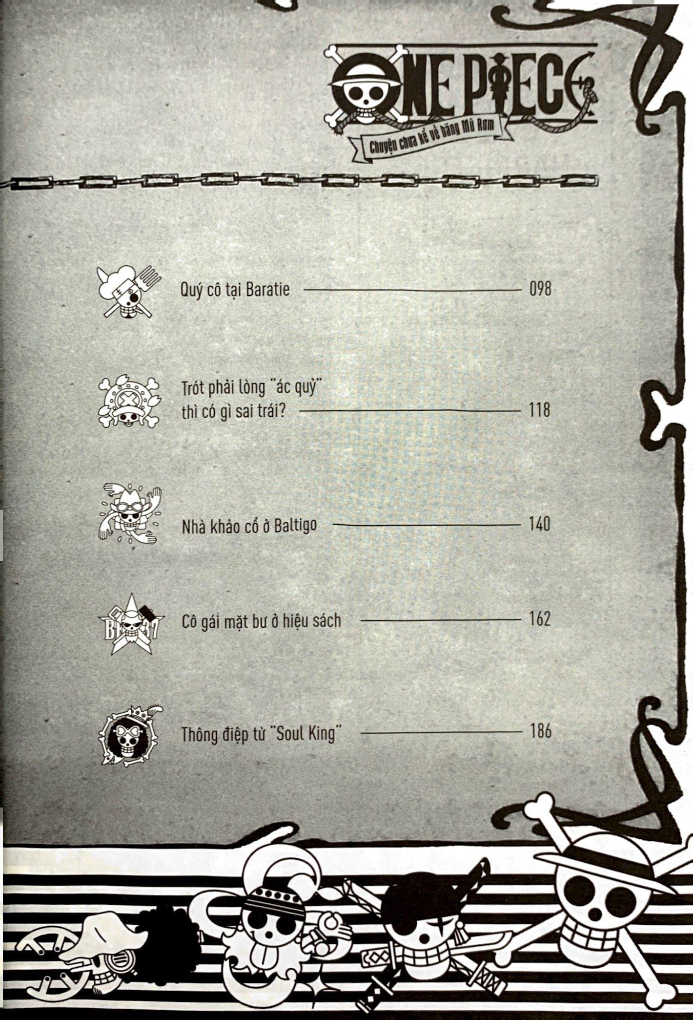 Tiểu Thuyết One Piece - Chuyện Chưa Kể Về Băng Mũ Rơm Một tác phẩm mang đến những góc nhìn mới đầy cảm hứng về các thành viên băng Mũ Rơm. Bạn sẽ có trong tay tập truyện ngắn qua lời kể của hai anh em binh sĩ đã tham gia trận chiến thượng đỉnh, màn “bình loạn” cực rôm rả về kiếm sĩ mạnh nhất của những người lính đã ngà ngà say, ước mơ được một lần trông thấy người đẹp trong mộng bằng xương bằng thịt của một anh chàng rụt rè hay được nghe chia sẻ về ước mơ trở thành nhà khảo cổ của một cô bé ở Baltigo… Loạt truyện hoàn toàn mới này sẽ khiến bạn yêu băng Mũ Rơm nhiều hơn những gì bạn tưởng đấy!!