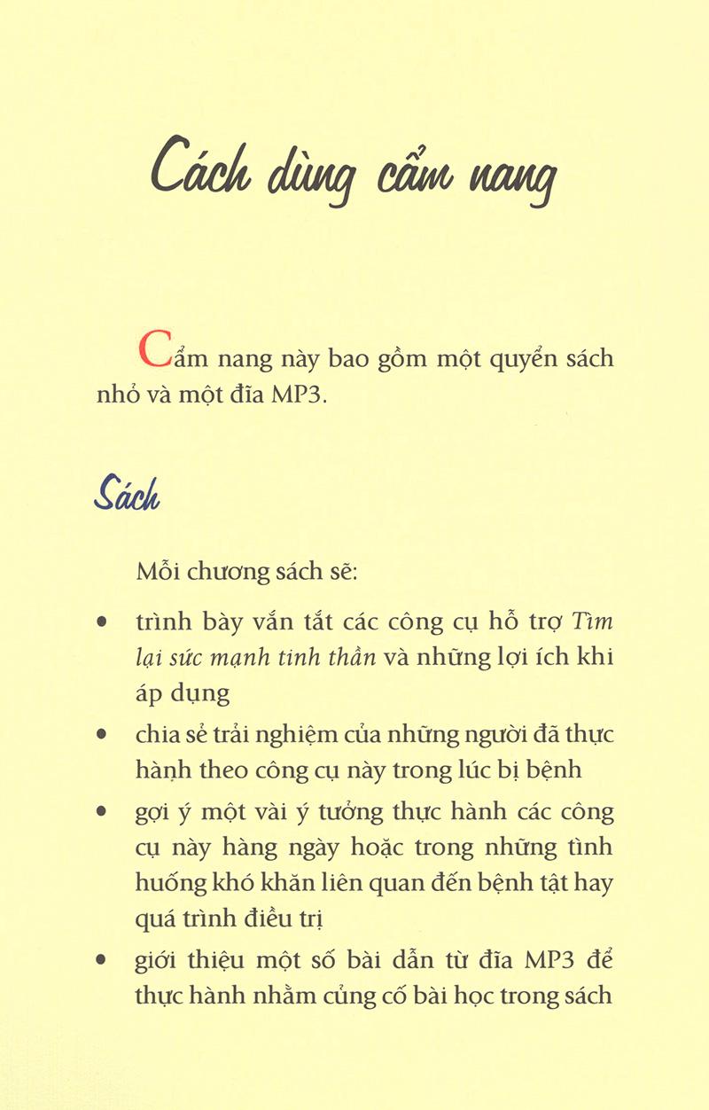 Một số công cụ giúp chuẩn bị tinh thần cho ca mổ và quá trình điều trị; trong khi những công cụ khác lại giúp ứng phó với đau đớn, lo âu hay trầm cảm. Cẩm nang này cũng hữu ích cho những ai muốn duy trì sức khoẻ, các nhóm hỗ trợ bệnh nhân, các trung tâm y tế và tư vấn, và những dịch vụ chăm sóc sức khoẻ khác.