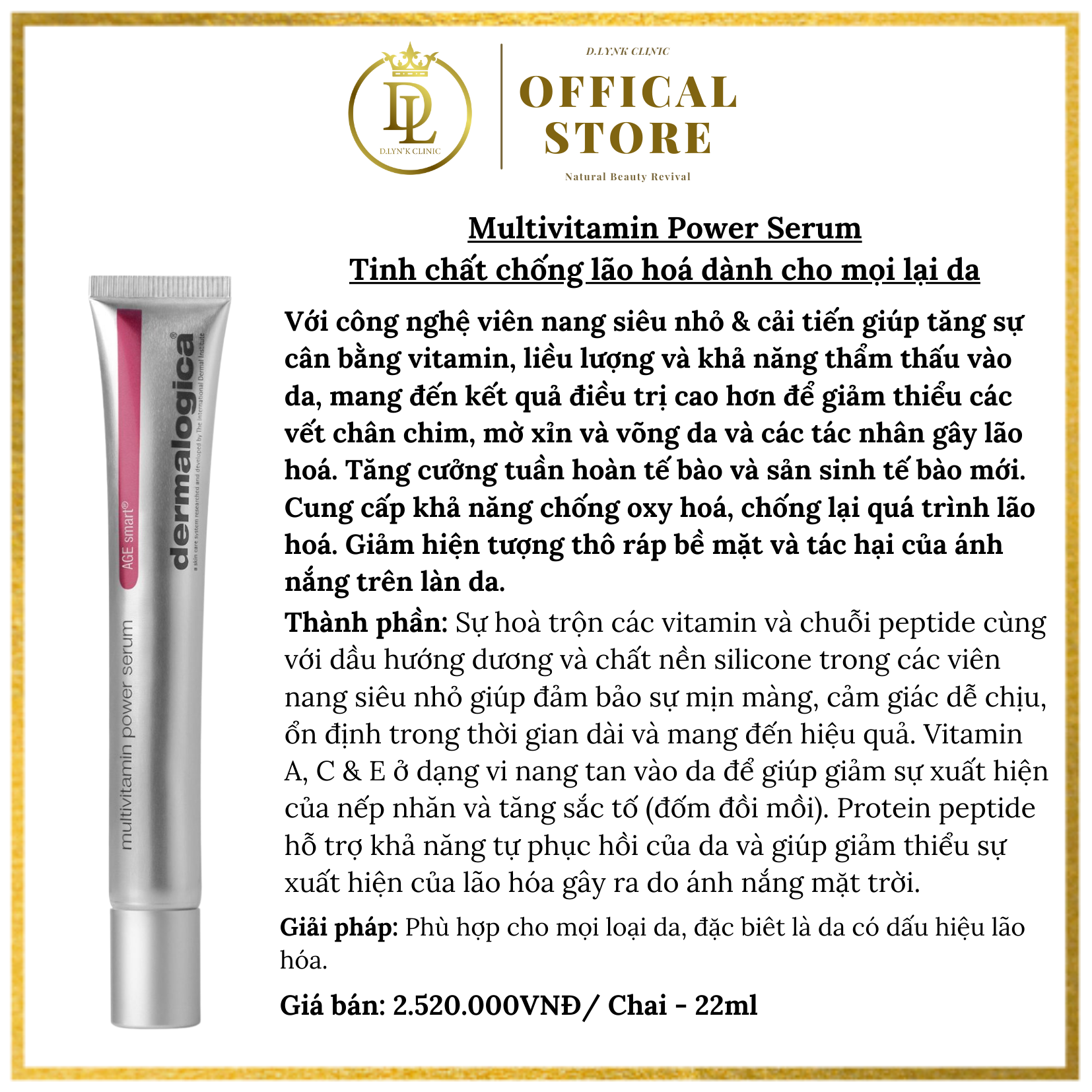Mua tại TiktokTinh chất chống lão hóa Dermalogica Multivitamin Power Serum 22ml dành cho mọi loại da Tinh Chất Chống Lão Hóa Dermalogica Multivitamin Power Serum là một trong những sáng tạo mới nhất của Dermalogica nhằm hỗ trợ làm giảm và ngăn ngừa lão hoá, được tạo nên từ các loại vitamin hữu ích như A, C, E giúp gia tăng sự phục hồi tự nhiên của da, giảm các nếp nhăn, đốm đồi mồi, hạn chế quá trình lão hoá. Các loại peptide protein trong sản phẩm này còn giúp nâng cao độ đàn hồi da, giảm thiểu các tác nhân sinh hoá gây lão hoá da từ bên trong. THÔNG TIN SẢN PHẨM