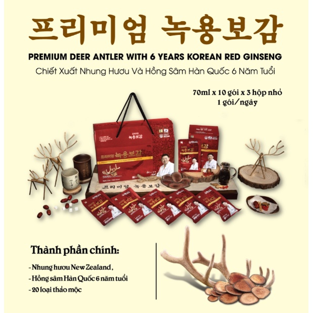 Premium Deer Antler With 6 Years Korean Red Ginseng Chiết Xuất Nhung Hươu Và Hồng Sâm Hàn Quốc 6 Năm Tuổi Quy cách: 1 HỘP 30 gói ( gồm 3 hộp lớn, mỗi hộp chứa