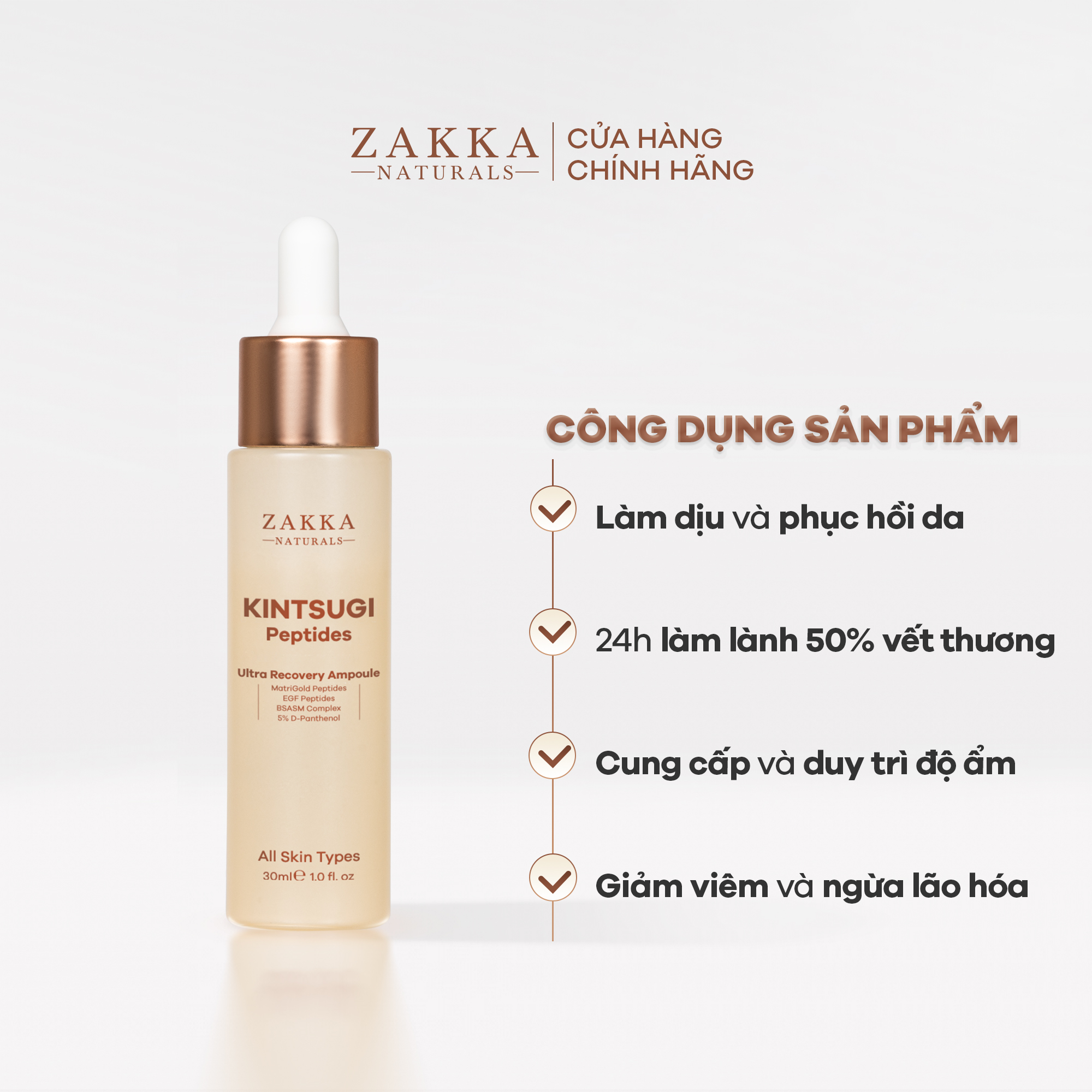 Tinh Chất Phục Hồi Độ ẩm Chuyên Sâu & Lành Tổn Thương Zakka Naturals Kintsugi Peptides Ultra Recovery Ampoule. Trong đó, 5 loại HA đa tầng giúp dưỡng ẩm khắp các tầng da và hỗ trợ phục hồi. Da được cải thiện và tái tạo nhanh chóng để làm lành vết thương nhờ các lợi ích của 6 loại peptides. Cùng với 8 loại chiết xuất thực vật hỗ trợ làm dịu ngay tức thì, và giảm viêm. 7 loại amino acids cấp ẩm và duy trì độ ẩm sâu trong da , đồng thời giúp quá trình phục hồi và làm lành da bị tổn thương diễn ra nhanh hơn.