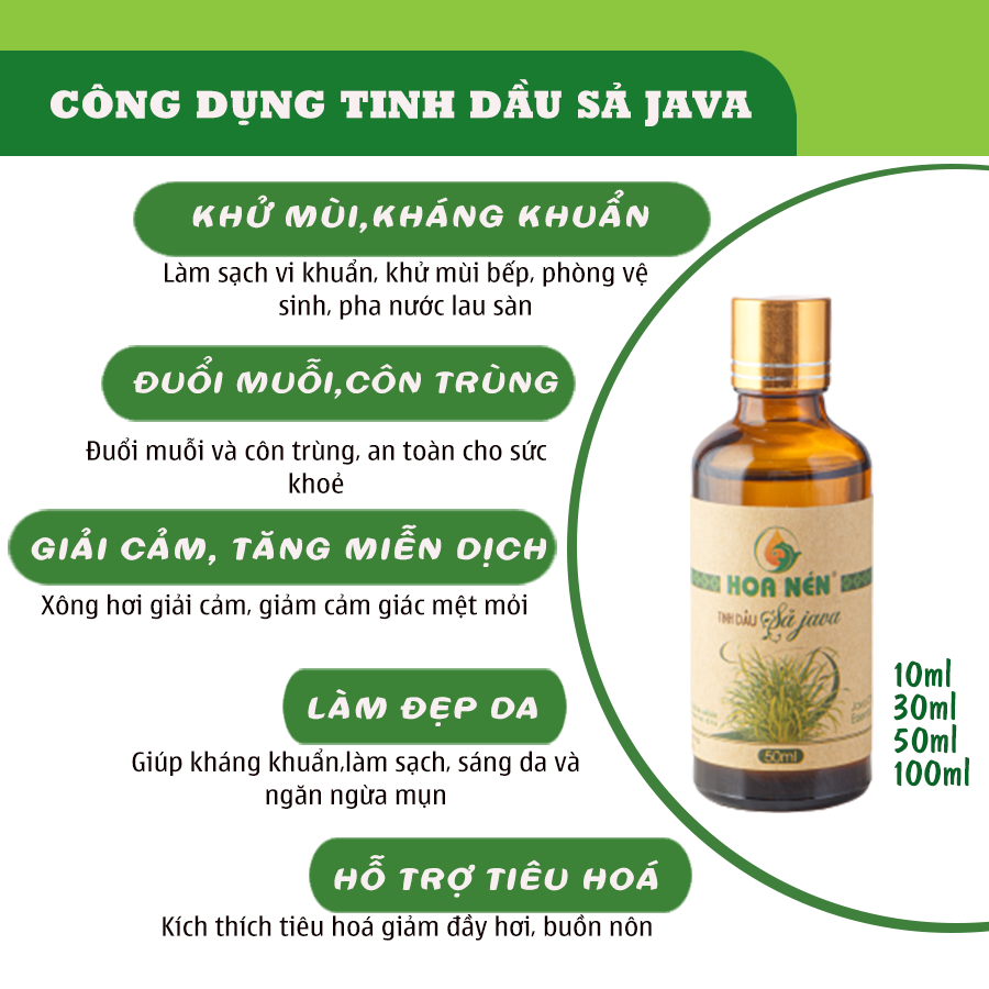 Mua tại TiktokTinh dầu sả java được chưng cất 100% từ lá và thân cây sả java - là cây sả cỏ, vị đắng ko ăn được như cây sả chanh. CÔNG DỤNG: