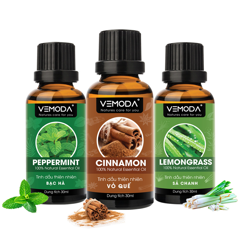 ✨Tinh dầu xông phòng, thư giãn cao cấp gồm 3 chai tinh dầu nguyên chất: tinh dầu Vỏ quế (30ml) + tinh dầu Bạc hà (30ml) + tinh dầu Sả chanh (30ml) Vemoda