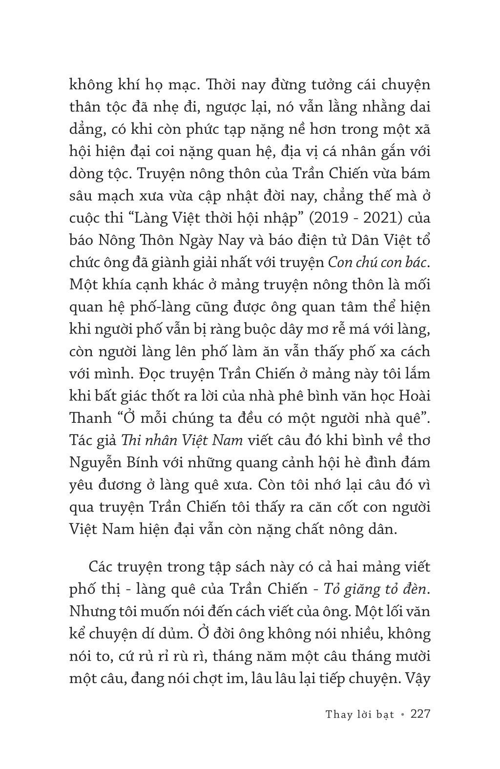 Trần Chiến - cây bút gắn chặt với Hà Nội - viết về những đổi thay của đời sống con người nông thôn hôm nay qua con mắt của một người ở phố nhưng đâu đó trong thẳm sâu vẫn "ngọ nguậy" đâu đó một làng quê trong m.ình.