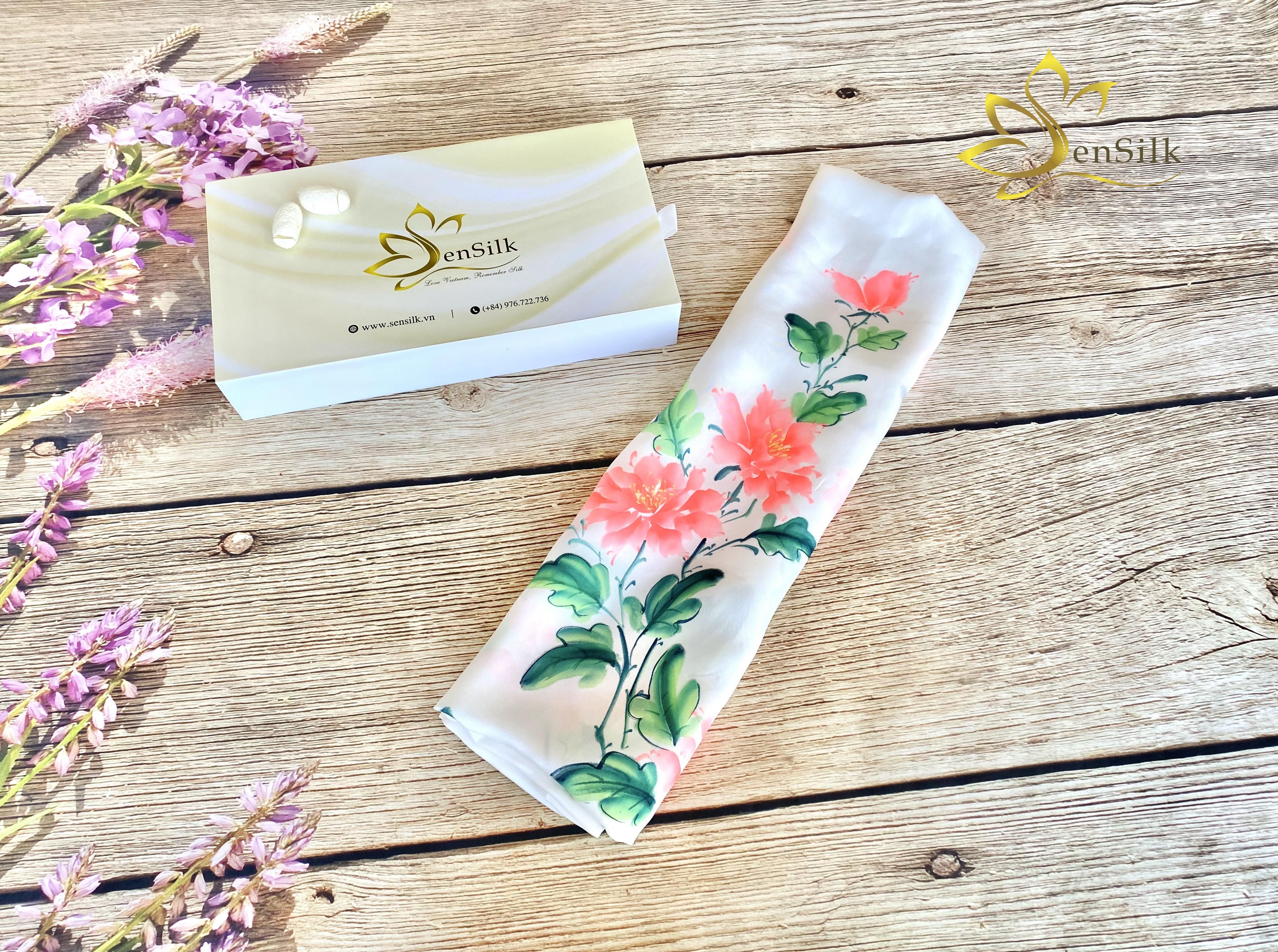 ✨Tơ Lụa Bảo Lộc Vẽ Tay Mẫu Đơn SenSilk - Quà Tặng Khách Vip 180x55cm, Khăn Lụa Tơ Tằm Vẽ Thủ Công Việt Nam
