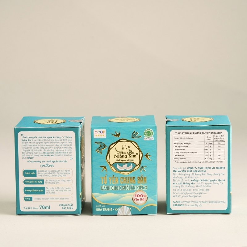 Yến Sào Hoàng Kim - Giải Pháp Dinh Dưỡng Lành Mạnh Cho Người Ăn Kiêng & Tiểu Đường Việc duy trì chế độ ăn uống lành mạnh không còn là một thử thách khi đã có Tổ Yến Chưng Sẵn Dành Cho Người Ăn Kiêng từ Yến Sào Hoàng Kim. Sản phẩm được nghiên cứu đặc biệt, hoàn toàn không sử dụng đường, thay thế bằng vị ngọt tự nhiên từ cỏ ngọt. Đây là lựa chọn hoàn hảo để bổ sung dinh dưỡng, tăng cường sức khỏe mà không gây ảnh hưởng đến cân nặng hay chỉ số đường huyết. Điểm Vượt Trội Của Sản Phẩm: -     Vị Ngọt Tự Nhiên, An Toàn Từ Cỏ Ngọt: Sản phẩm sử dụng 100% chiết xuất cỏ ngọt tự nhiên để tạo vị ngọt, không chứa calo, là lựa chọn lý tưởng cho người đang trong chế độ ăn kiêng, giảm cân hoặc cần kiểm soát đường huyết. -     Chất Lượng Được Nhà Nước Bảo Chứng OCOP 4 Sao: Được UBND tỉnh Khánh Hòa chứng nhận OCOP 4 sao năm 2024, khẳng định chất lượng và độ an toàn của sản phẩm. -     An Toàn Tuyệt Đối - Không Chất Bảo Quản: Sản xuất theo quy trình đạt chuẩn quốc tế HACCP , cam kết không sử dụng chất bảo quản, đảm bảo sự tinh khiết và an toàn cho người dùng. -     Hỗ Trợ Sức Khỏe & Vóc Dáng: Cung cấp nguồn dưỡng chất quý giá từ yến sào nguyên chất, giúp cơ thể khỏe mạnh, tỉnh táo mà không làm bạn đi chệch hướng khỏi mục tiêu vóc dáng của mình. Thông Tin Chi Tiết Sản Phẩm: Thương hiệu: Yến Sào Hoàng Kim Xuất xứ: Việt Nam Thành phần: Nước (68.5g), yến sào nguyên chất (1.5g yến khô, tương đương 12.6g yến tươi), cỏ ngọt, gừng tươi. Đối tượng sử dụng: Người ăn kiêng, người cần kiểm soát đường huyết, người theo đuổi lối sống lành mạnh. Hướng dẫn sử dụng: Lắc đều trước khi uống, ngon hơn khi uống lạnh. Nên dùng hết sau khi mở nắp. Hạn sử dụng: 12 tháng.