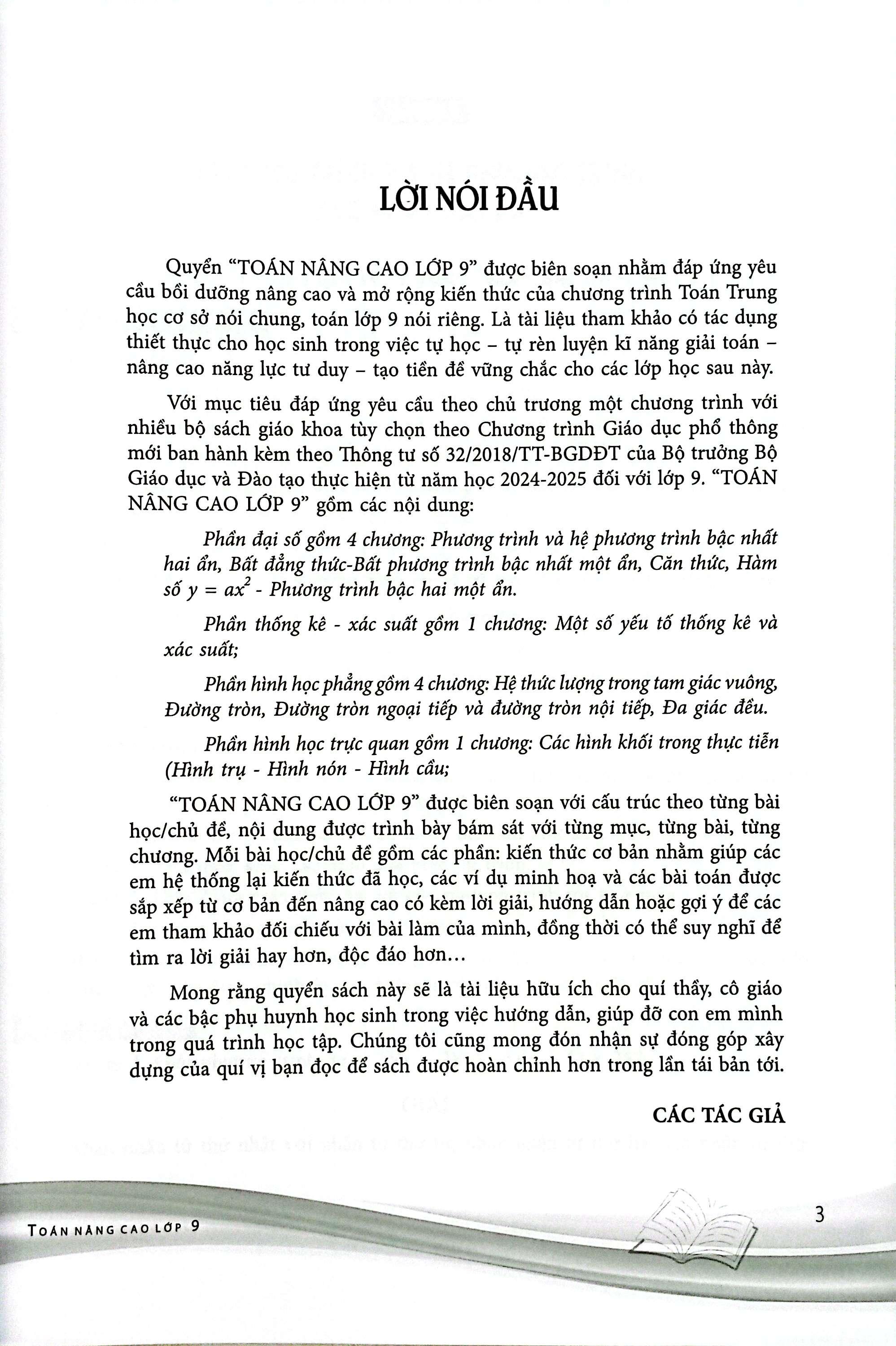 Với mục tiêu đáp ứng yêu cầu theo chủ trương một chương trình với nhiều bộ sách giáo khoa tùy chọn theo Chương trình Giáo dục phổ thông mới ban hành kèm theo Thông tư số 32/2018/TT-BGDĐT của Bộ trưởng Bộ Giáo dục và Đào tạo thực hiện từ năm học 2024-2025 đối với lớp 9. “TOÁN NÂNG CAO LỚP 9” gồm các nội dung: