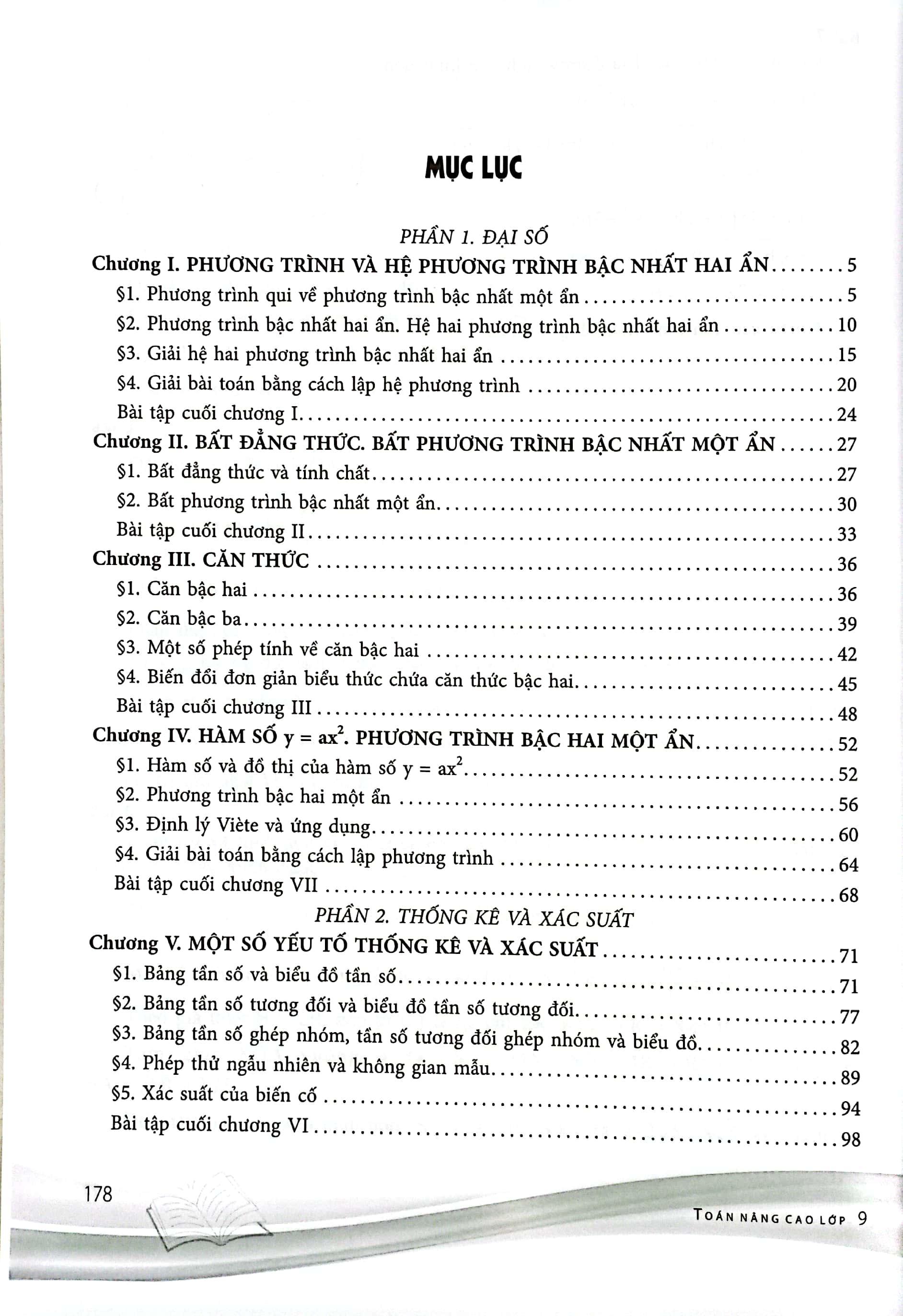 Phần đại số gồm 4 chương: Phương trình và hệ phương trình bậc nhất hai ẩn, Bất đẳng thức-Bất phương trình bậc nhất một ẩn, Căn thức, Phương trình bậc hai một ẩn.