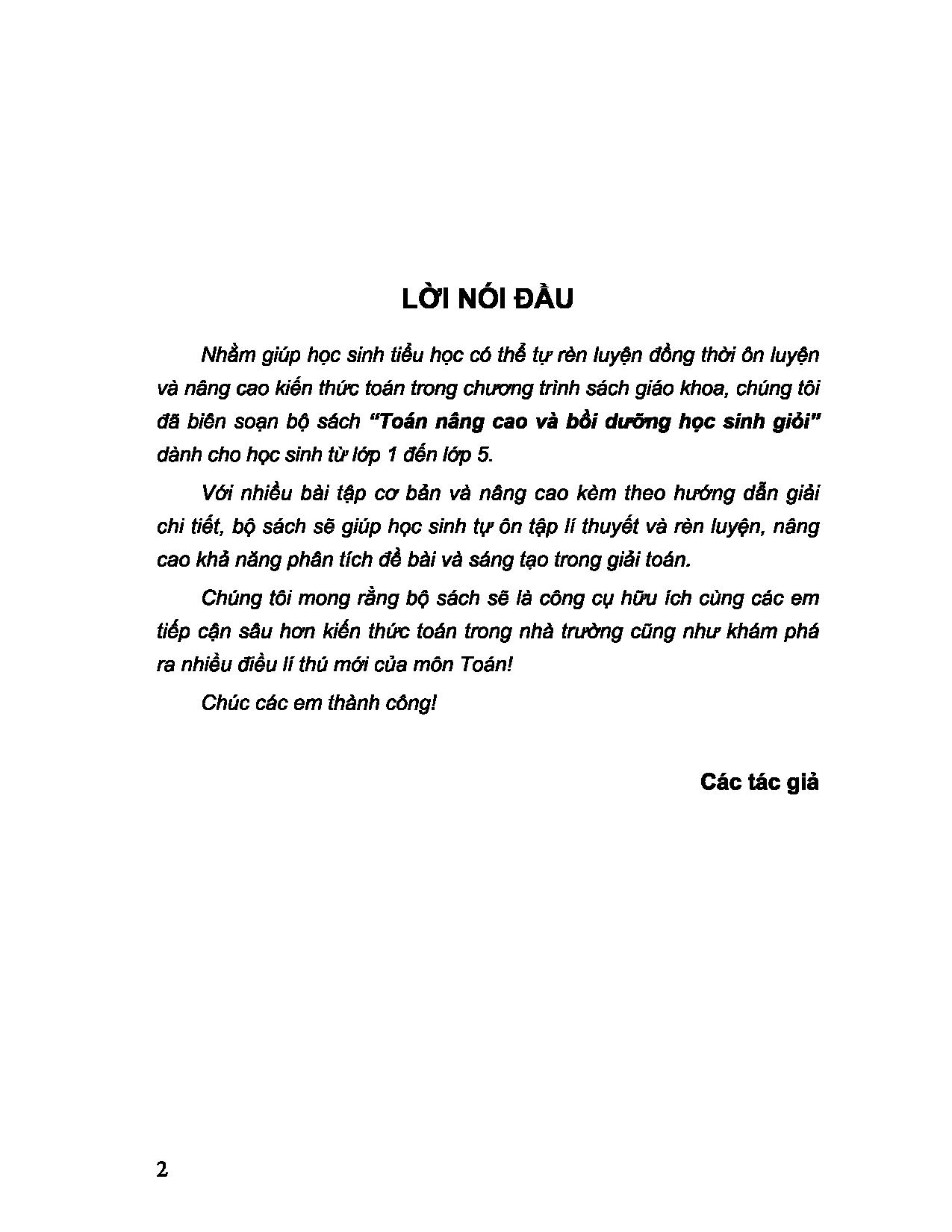 Nhằm giúp học sinh tiểu học có thể tự rèn luyện và nâng cao kiến thức môn Toán, chúng tôi đã biên soạn bộ sách “Toán nâng cao và bồi dưỡng học sinh giỏi –
