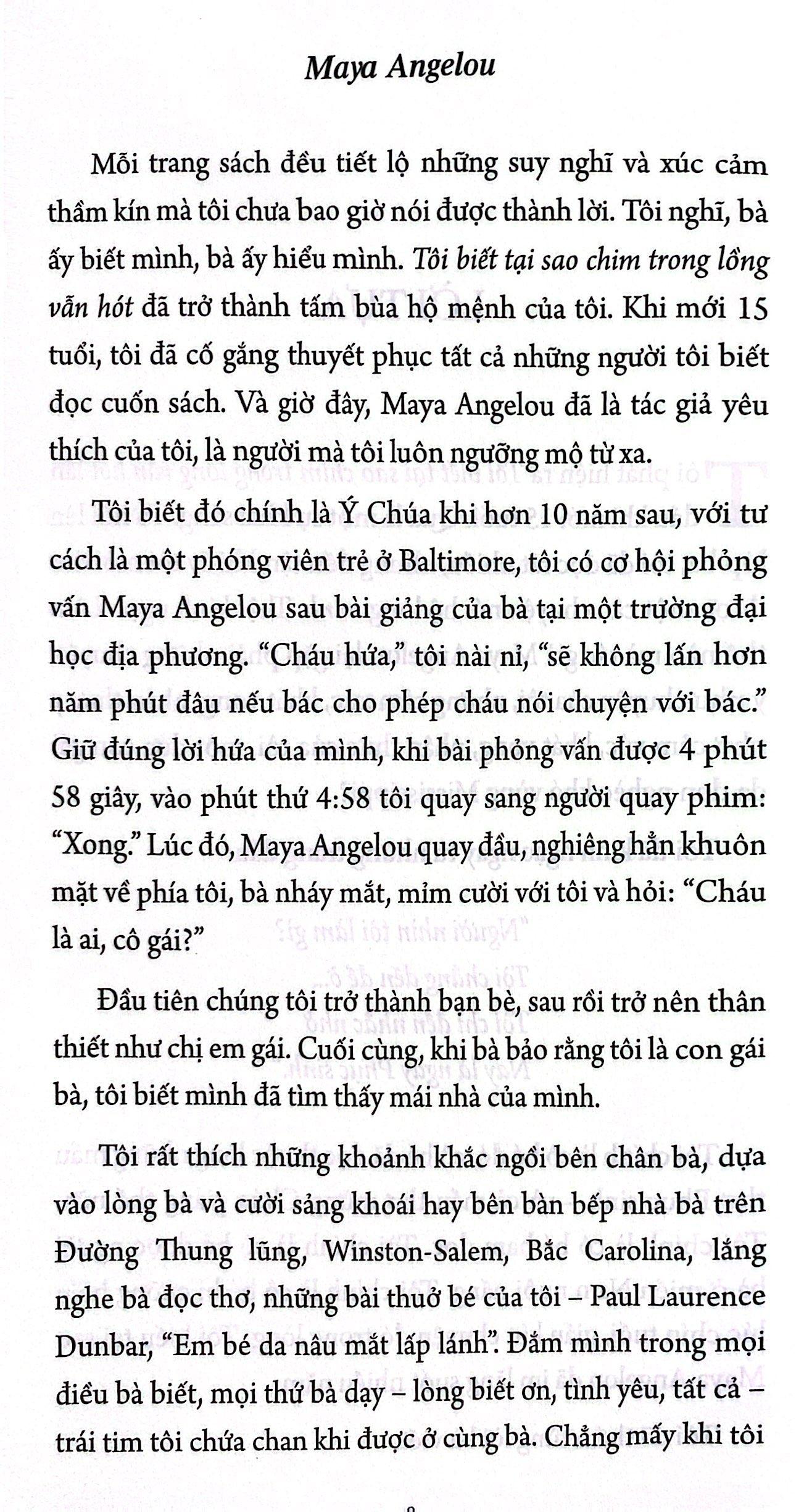 Maya Angelou (4 tháng 4 năm 1928 – 28 tháng 5 năm 2014) là một nhà thơ, tác giả viết hồi ký, diễn viên nổi tiếng người Mỹ. Bà cũng là nhân vật quan trọng trong phong trào đấu tranh chống phân biệt c.hủng tộc và vì công bằng xã hội. Trong suốt cuộc đời, bà đã xuất bản bảy cuốn tự truyện, ba cuốn sách tiểu luận cùng nhiều tập thơ, vở kịch, sách thiếu nhi. Bà cũng tham gia trong lĩnh vực phim ảnh và chương trình truyền hình kéo dài hơn năm mươi năm. Bà đã nhận được hàng chục giải thưởng và hơn ba mươi bằng tiến sĩ danh dự.