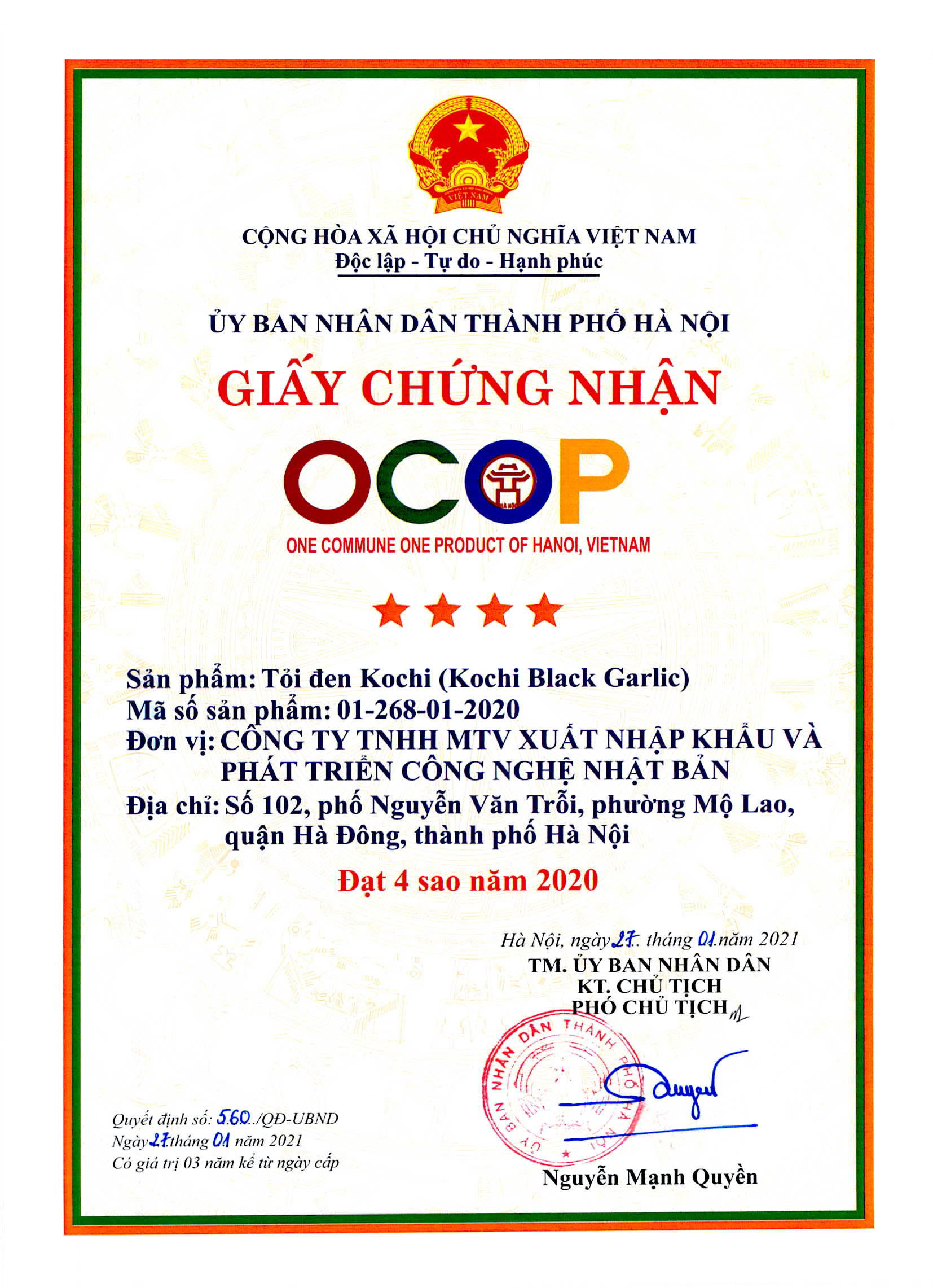 Tỏi đen Kochi đã đạt được nhiều danh hiệu uy tín như TOP 2 hàng Việt Nam được người tiêu dùng yêu thích bình chọn; Hàng Việt Nam chất lượng cao; OCOP 4 sao. Tới nay, tỏi đen Kochi đã và đang xuất khẩu nhiều nước trên thế giới như Mỹ, Thụy Sĩ, Hàn Quốc.
