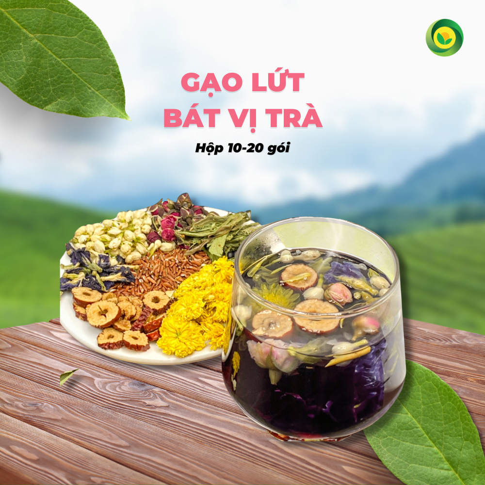GẠO LỨT BÁT VỊ TRÀ Công thức phối kết tuyệt vời từ 8 loại thảo dược như Gạo lứt, Đậu đen, Táo đỏ kết hợp với Nụ nhài, Nụ hồng, Cúc vàng, Hoa đậu biếc, Cỏ ngọt với những công dụng m.á.t g.a.n, g.i.ả.i đ.ộ.c, eo thon dáng đẹp da dẻ hồng hào, ... Giúp b.ả.o v.ệ các cơ quan bên trong cơ thể và tạo nên sắc vóc bên ngoài thật xinh tươi, đầy sức sống