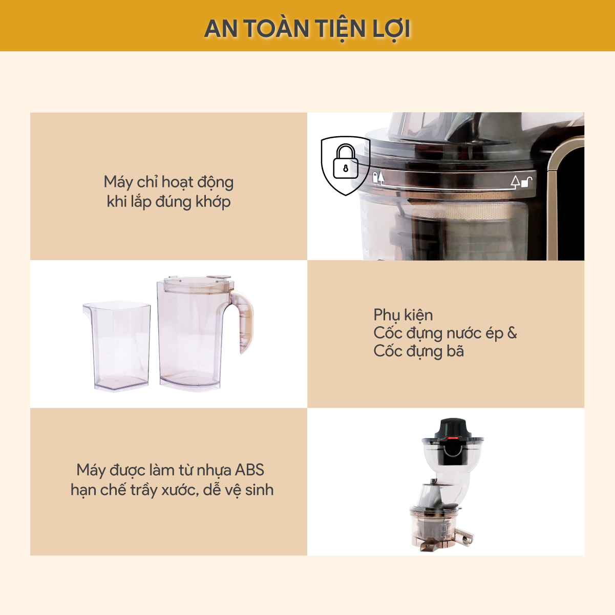 Ép với tốc độ chậm 35-45 vòng/phút, tối đa khả năng chiết xuất, bảo toàn các vitamin và dưỡng chất.