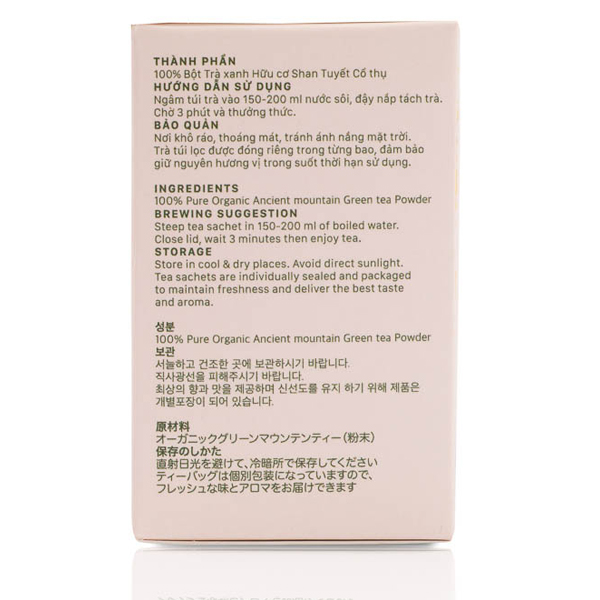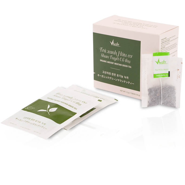 TRÀ XANH HỮU CƠ Shan Tuyết Cổ Thụ (túi lọc) Hướng dẫn sử dụng: Ngâm túi trà vào 200ml nước sôi, đậy nắp tách trà. Chờ 3 - 5 phút, thưởng thức. Có thể pha 2 lần nước Bảo quản: Nơi khô ráo, thoáng mát. Tránh ánh sáng trực tiếp. Trà được đóng riêng từng bao, đảm bảo giữ nguyên hương vị trong suốt thời gian sử dụng Xuất xứ: Việt Nam Sản xuất tại: CÔNG TY CỔ PHẦN VIỆT HERBS Giới thiệu trà hữu cơ Shan tuyết cổ thụ VHERBS Trà Shan tuyết cổ thụ Vherbs, thuộc vùng trà cổ tự nhiên hàng trăm năm tuổi trên vùng núi cao 1300 – 1900 m thuộc huyện Hoàng Su Phì, tỉnh Hà Giang. Một huyện miền núi với cung đèo đẹp nhưng cũng hiểm trở nhất của tỉnh Hà Giang. Theo kinh nghiệm gia truyền của các bậc lão niên , để có ấm trà ngon phải đảm bảo đủ các yếu tố: