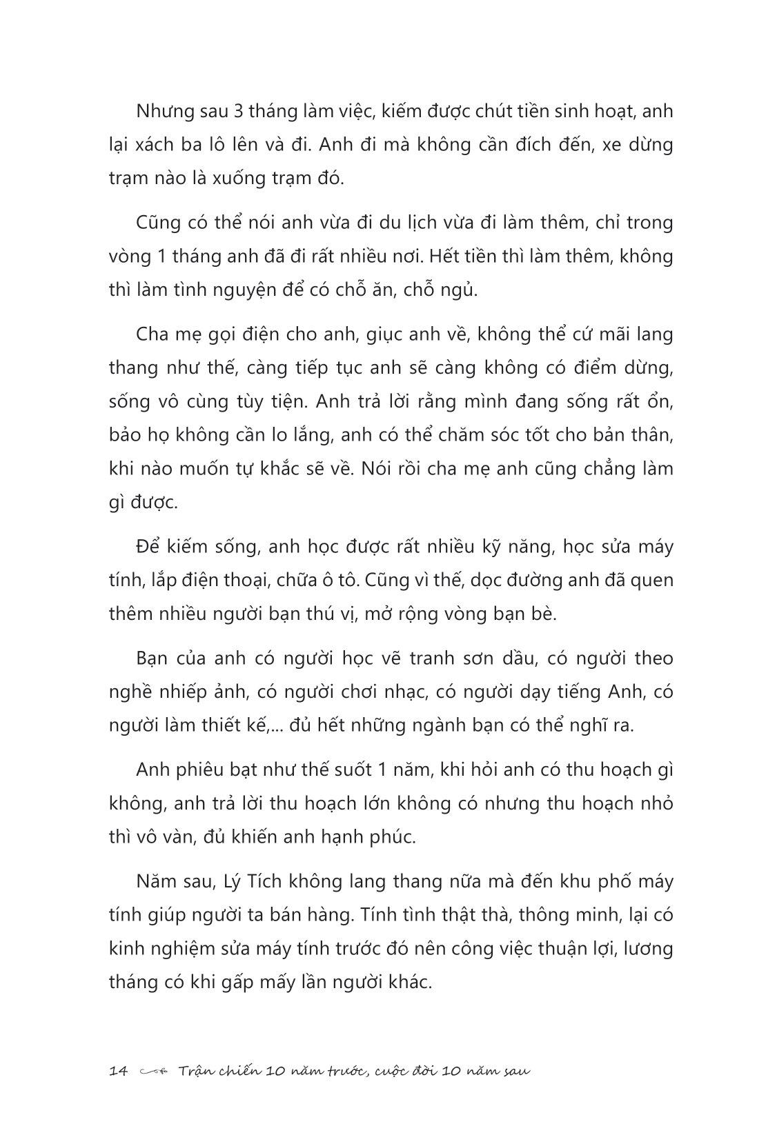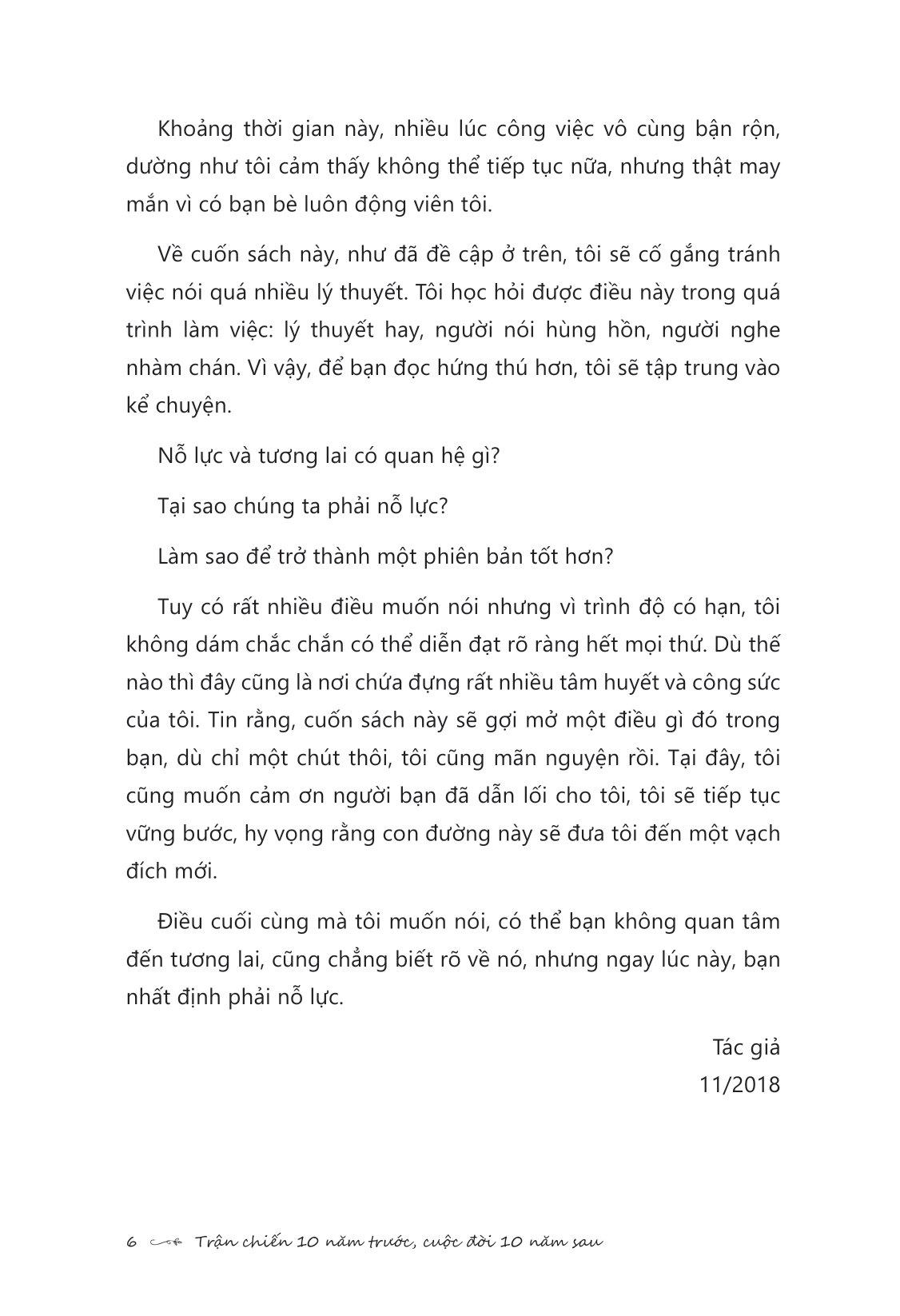 Trận Chiến 10 Năm Trước, Cuộc Đời 10 Năm Sau “Nếu chúng ta cho rằng bình phàm là đáng quý, ta sẽ hài lòng với bản thân của hiện tại, lựa chọn những điều dễ dàng, sống cho qua ngày mà quên mất trên đời có những người không màng tất cả để sống đời huy hoàng rực rỡ.” Các bạn trẻ, tương lai của các bạn đang được xây dựng và tích lũy dựa trên những quyết tâm ở ngay giây phút này. Vậy nên tuổi trẻ đừng chọn an nhàn, đừng tính toán thiệt hơn, đừng trì hoãn các mục tiêu, đừng nhụt chí sau thất bại. Trận chiến 10 năm trước chính là cuộc đời của bạn 10 năm sau!