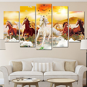 Mua tại TiktokTranh Mã đáo thành công đem lại may mắn và tài lộc cho gia chủ Bộ gồ 5 bức ghép Kích thước rộng 1,5m cao 90cm (30cmx60cmx2 bức+30cmx80cmx2 bức+30cmx90cmx1 bức) Chất liệu: Tranh in trên giấy in ảnh cán PP bóng (chống bay, phai màu, nhoè ảnh), cán trên gỗ MDF (gỗ công nghiệp sau phủ Fox) dày 12 ly Bộ sản phẩm gồm: Tranh + đồng hồ Gửi kèm vít bắt tường