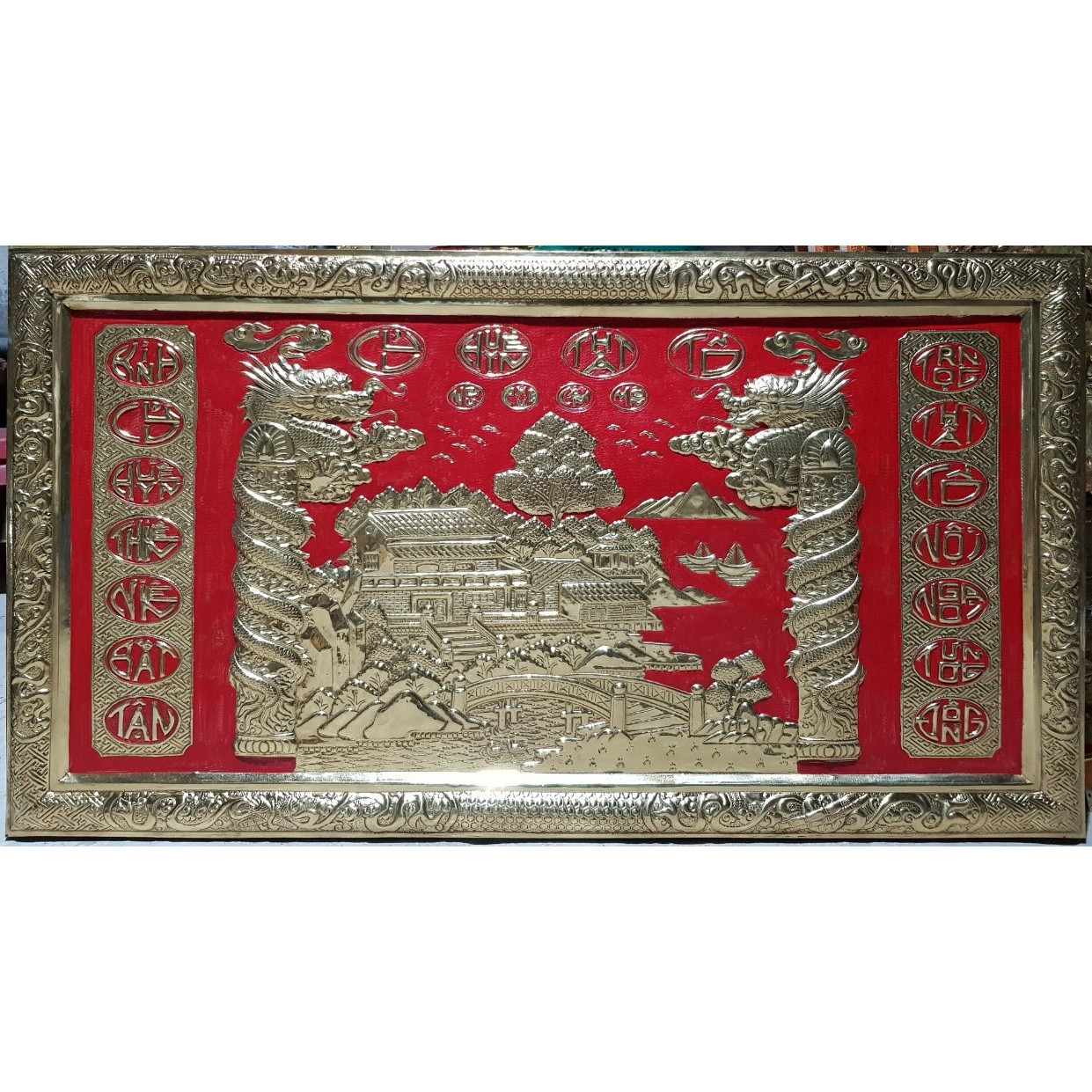 Tranh liễn thờ tổ tiên. CỬU -HUYỀN – THẤT- TỔ (thờ 9 đời nội ngoại) Sản phẩm được chế tác thủ công rất tinh xảo từ đồng vàng nguyên chất, liền tấm tranh và khung bằng đồng . Kích thước phủ khung 76*139cm