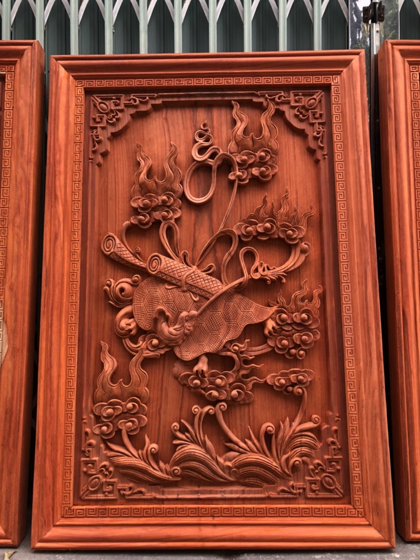Tranh treo tường trạm khắc tứ linh được làm bằng chất liệu gỗ hương đỏ tự nhiên 100%  Kích thước 37×107×4cm và có nhiều kt khác nhau ,Cũng như độ dầy của gỗ khách muốn được kt như nào nhắn tin cho mình , _ Tranh treo tường trạm ,khắc tứ linh ,được trạm khắc tỉ mỉ ,Tinh sảo kỳ công .Đi hầu hết tất cả mọi chi tiết góc ngách nội dung hoa văn của tranh ,đều được ngọt tỉa chỉnh sửa hoàn toàn bằng tay thủ công .Đồng thời tranh được kiểm định kỹ lưỡng .Mục đích trống dập nứt vênh mo mối mọt .Kết hợp với trà nhám ,Đánh giấy giáp nhiều nước ,cho sạch sẽ sờ mát lạnh ,Rồi cho vào phun lót làm bóng mờ ,Để giữ lại mầu sắc vân gỗ tự nhiên .Tranh tứ linh được làm và hoàn thiện do bàn tay khối óc tài hoa ,Từ những người thợ giàu kinh nghiệm ,cũng như tay nghề cao trong làng nghề truyền thống .Chính vì thế tranh tứ linh đã đáp ứng đầy đủ những tiêu trí ( Đẹp bền rẻ ) Thẩm mỹ nghệ thuật với chất lượng tuyệt vời