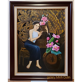 Tranh sơn dầu thiếu nứ & hoa sen Chất liệu tranh sơn dầu vẽ tay trên vải toan ( vải bố ) chuyên dụng Khung tranh màu vân gỗ Composits cao cấp không cong vênh
