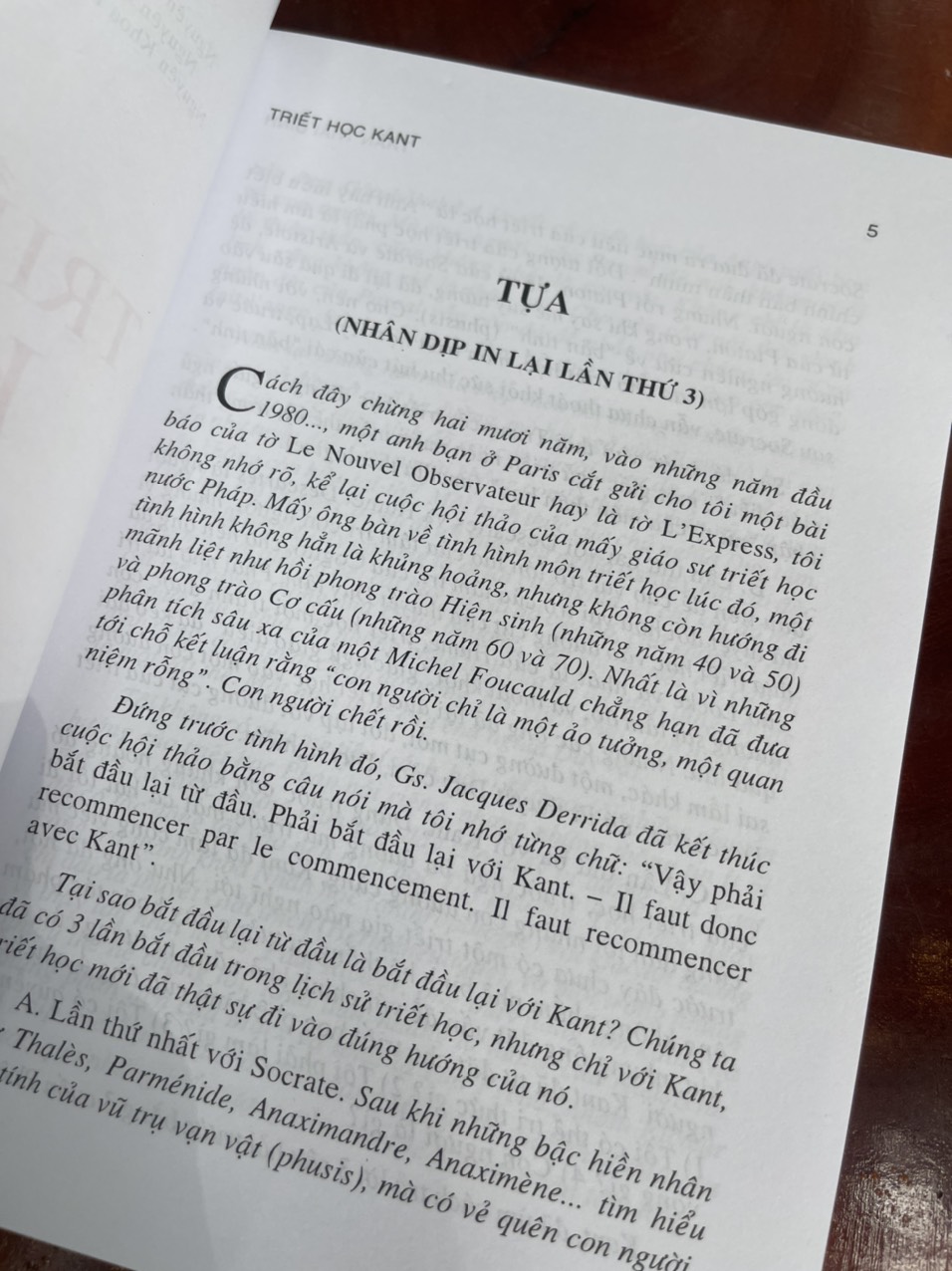 Kant đã làm con người tỉnh giấc mơ tiên, biết mình không phải là thần thánh, mà là người; biết mình là hữu thể hữu hạn chứ không phải là hiện thể tuyệt đối. Trước Kant, chúng ta đã có 2 lần bắt đầu trong lịch sử triết học (lần thứ nhất với Socrate với mục tiêu “Anh hãy hiểu biết chính bản thân mình”, đi qua các đời Platon, Aristote rồi trải qua mười mấy thế kỷ trong đêm trường Trung cổ, triết học đã ngủ giấc ngủ giáo điều trong thân phận nữ tỳ của thần học; lần thứ hai với Descartes đưa triết học vào hẻm cụt của thuyết Duy tâm – thuyết đã gán cho con người những khả năng mà con người không có được, sau đó là Locke và Hume, triết học thoát khỏi giấc ngủ giáo điều nhưng lại đi vào một ngõ cụt khác: đó là thuyết Duy cảm, Duy nghiệm – đối lập với thuyết Duy tâm) và phải đến lần thứ 3, với Kant, triết học mới thật sự đi vào đúng hướng của nó, “Vậy phải bắt đầu lại từ đầu. Phải bắt đầu lại với Kant.” – Jacques Derrida (1930-2004)