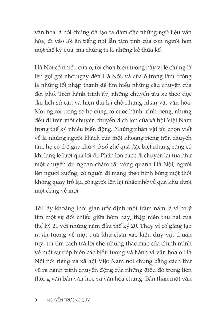 Trong khoảng một trăm năm qua, người Hà Nội đã đi trên những phương tiện gì, đã qua những con phố, ngã tư, quảng trường nào, đã chọn những điểm đến ở đâu, tâm tình của họ trên những hành trình ấy là gì, và tất cả những điều ấy biến đổi theo chuyển dịch của bánh xe lịch sử ra sao, đấy là một câu chuyện vừa lớn lao vừa tinh tế mà cuốn sách này có tham vọng kể lại.