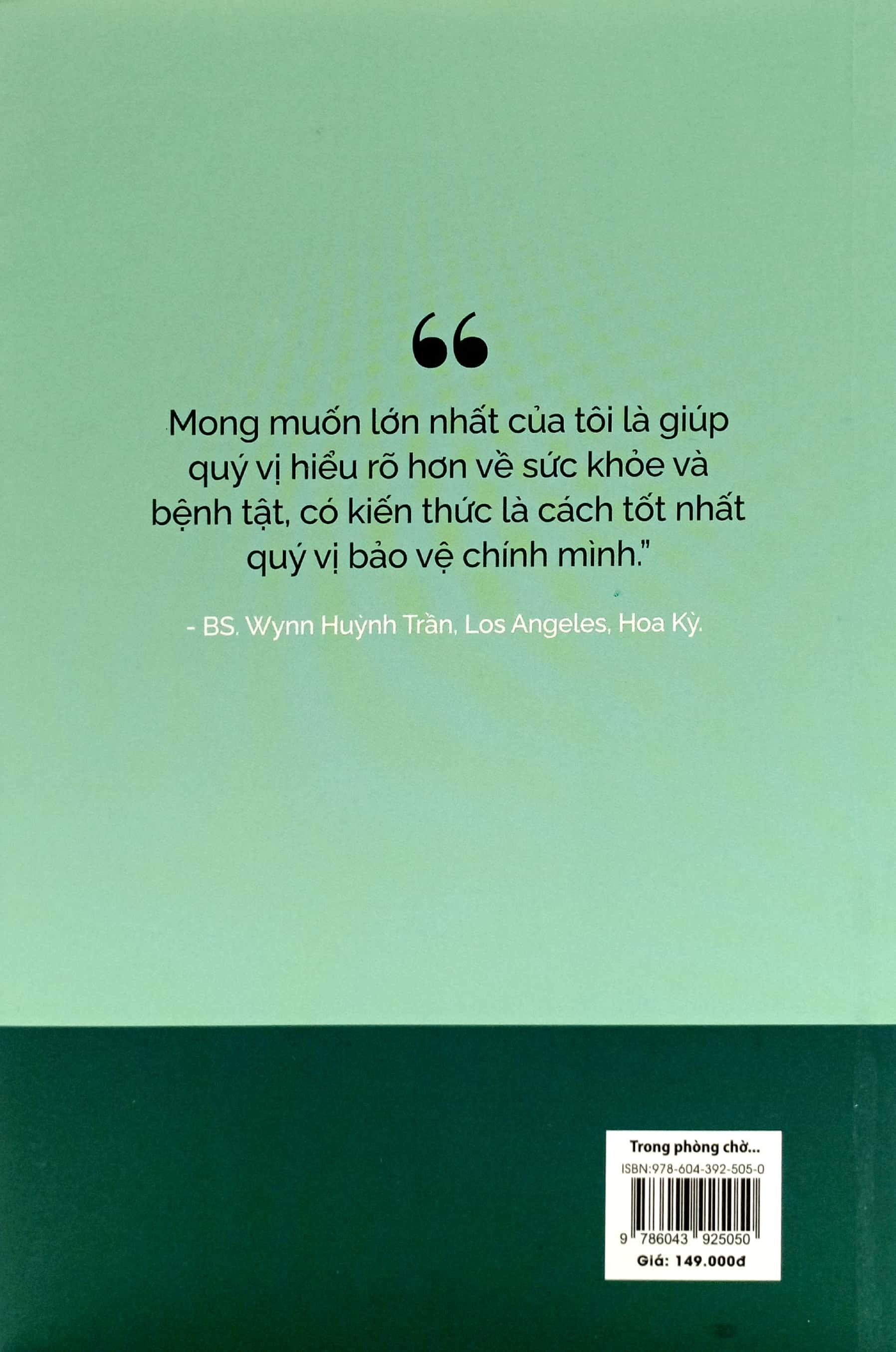 Sau khi quyển sách "Trong phòng chờ với Bác sĩ Wynn" tập 1 được đón nhận, Bác sĩ Wynn tiếp tục cho ra mắt "Trong phòng chờ với Bác sĩ Wynn" tập 2 với nhiều bài viết bổ sung về kiến thức y học thường thức, giúp quý vị độc giả có thêm kiến thức để bảo vệ sức khỏe của bản thân và gia đình. Với sức khỏe, đừng nghe tin đồn, hãy nghe bác sĩ và kiến thức y khoa.